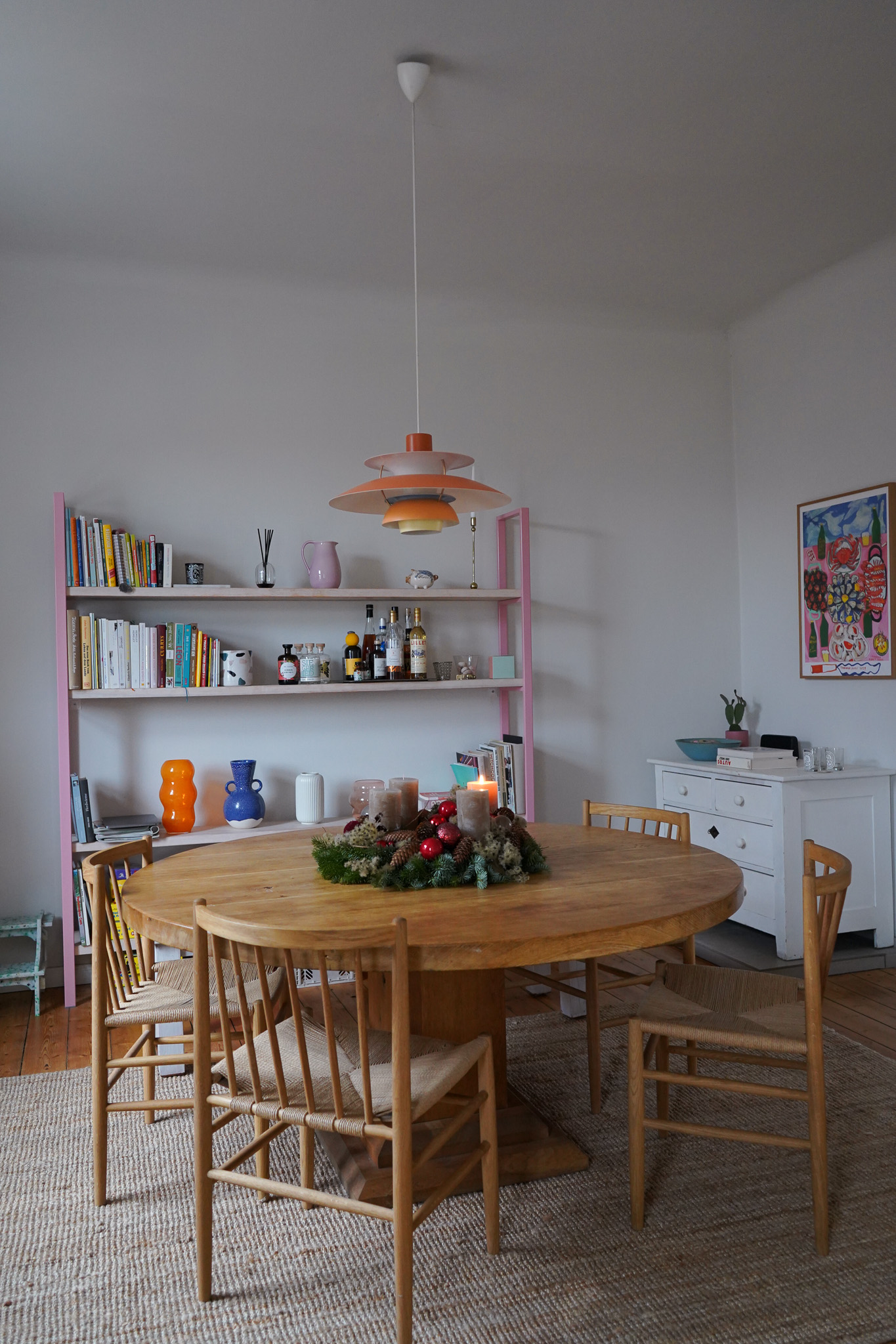 Wir haben jedes Jahr diese Fake-Tannen-Lichterkette. Dazu kommen verschiedene Wabenornamente in Grau, Rosa, Bordeaux und Natur. Gelegentlich muss eines davon ersetzt werden. Ansonsten ist die Treppe in 30 Minuten geschmückt. Voll easy, denn hier ist Jahresendspurt angesagt und keiner von uns hat Zeit für große Deko-Arien. Unser Adventskranz ist ebenfalls wie in den Jahren davor von Juliane Grützmacher aus Schopsdorf. Flori hat ihn ausgesucht und er ist so groß wie ein Autoreifen.