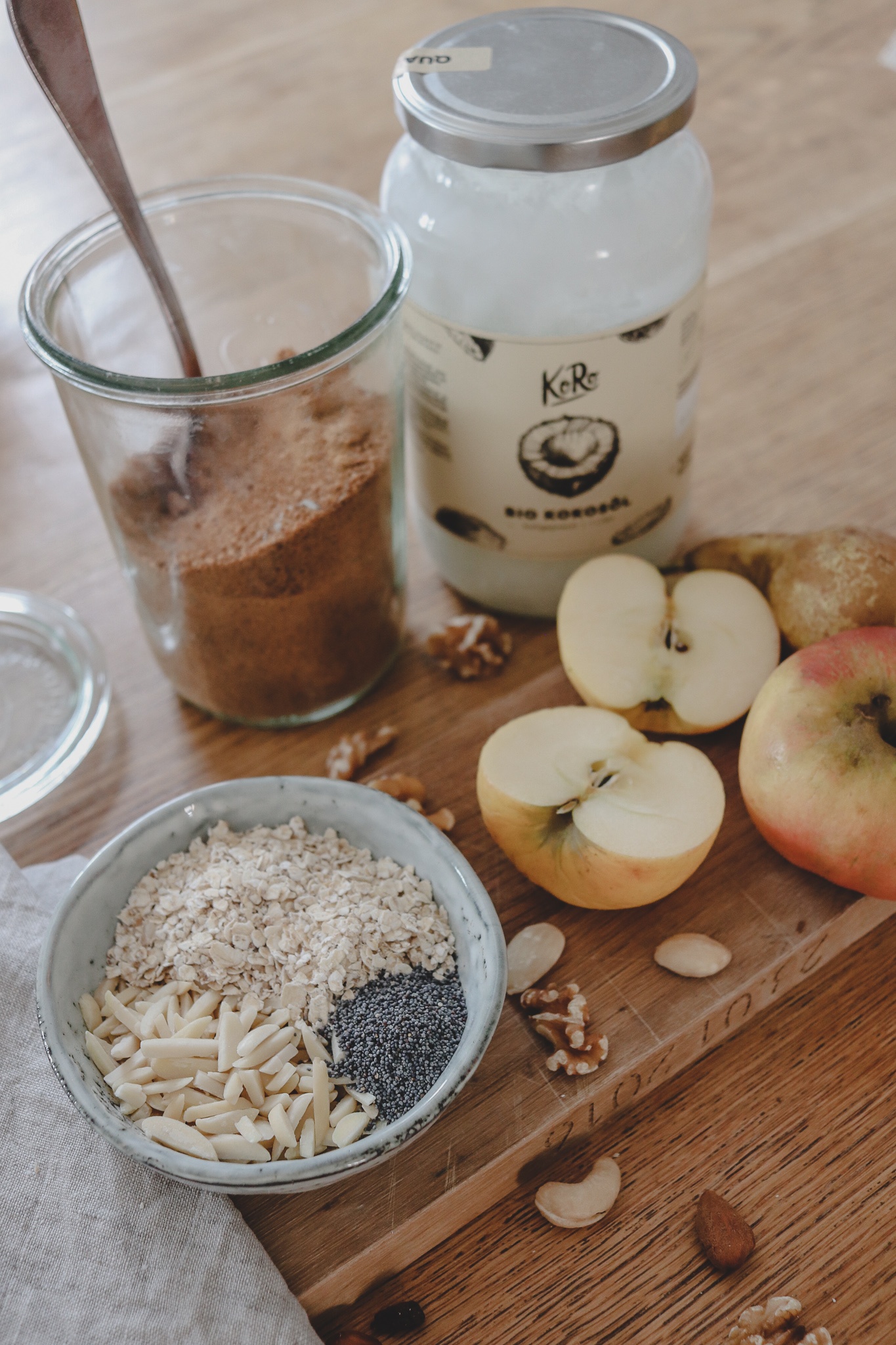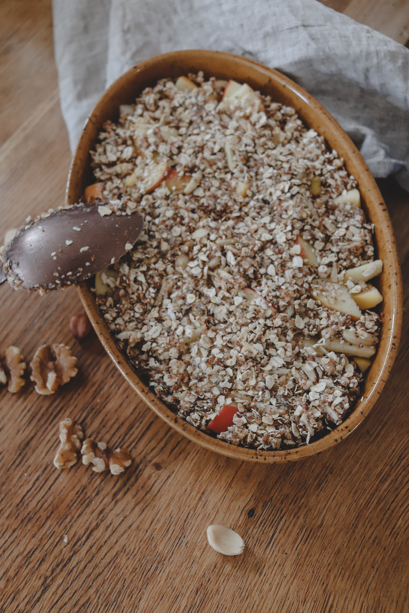 Dazu kommen aus Fett, Getreidemehl und Zucker gebackene Streusel. Ich mache gerne eine gesündere Crumble-Variante mit Kokosöl statt Butter, Haferflocken statt Mehl und Bio-Kokosblütenzucker statt weißem Zucker. Vor allem die Zugabe von Mohn und Mandeln holt sowohl optisch als auch geschmacklich mehr aus der Nachspeise raus.