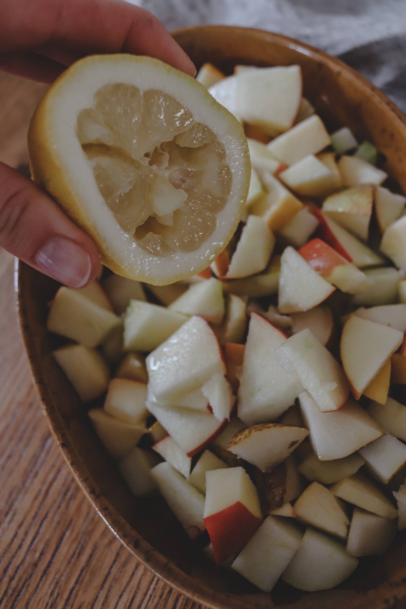 Die Äpfel waschen, putzen und in kleine Stückchen schneiden, die später im Ofen schnell garen. Die Auflaufform mit den Apfelstückchen füllen. Den Saft einer Zitrone darüber auspressen, damit die Äpfel nicht braun werden und der Auflauf schön frisch schmeckt. Mit allen anderen Obstsorten ähnlich verfahren.
