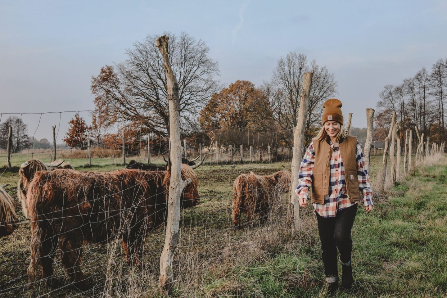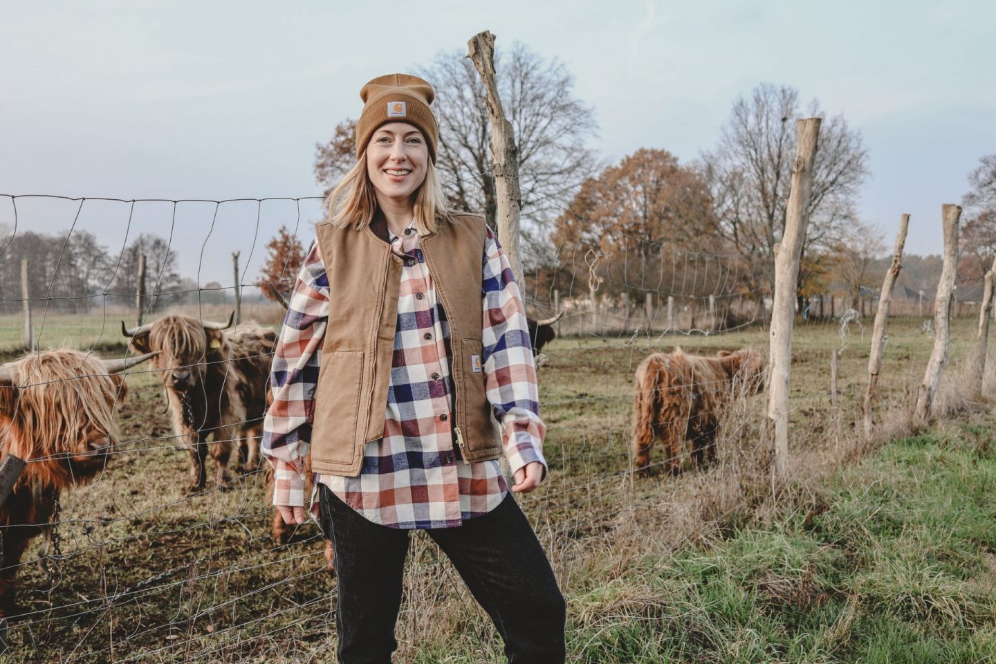 Mütze und Weste: Carhartt, Flanellhemd: Closed, Jeans: Closed, Stiefel: Timberland