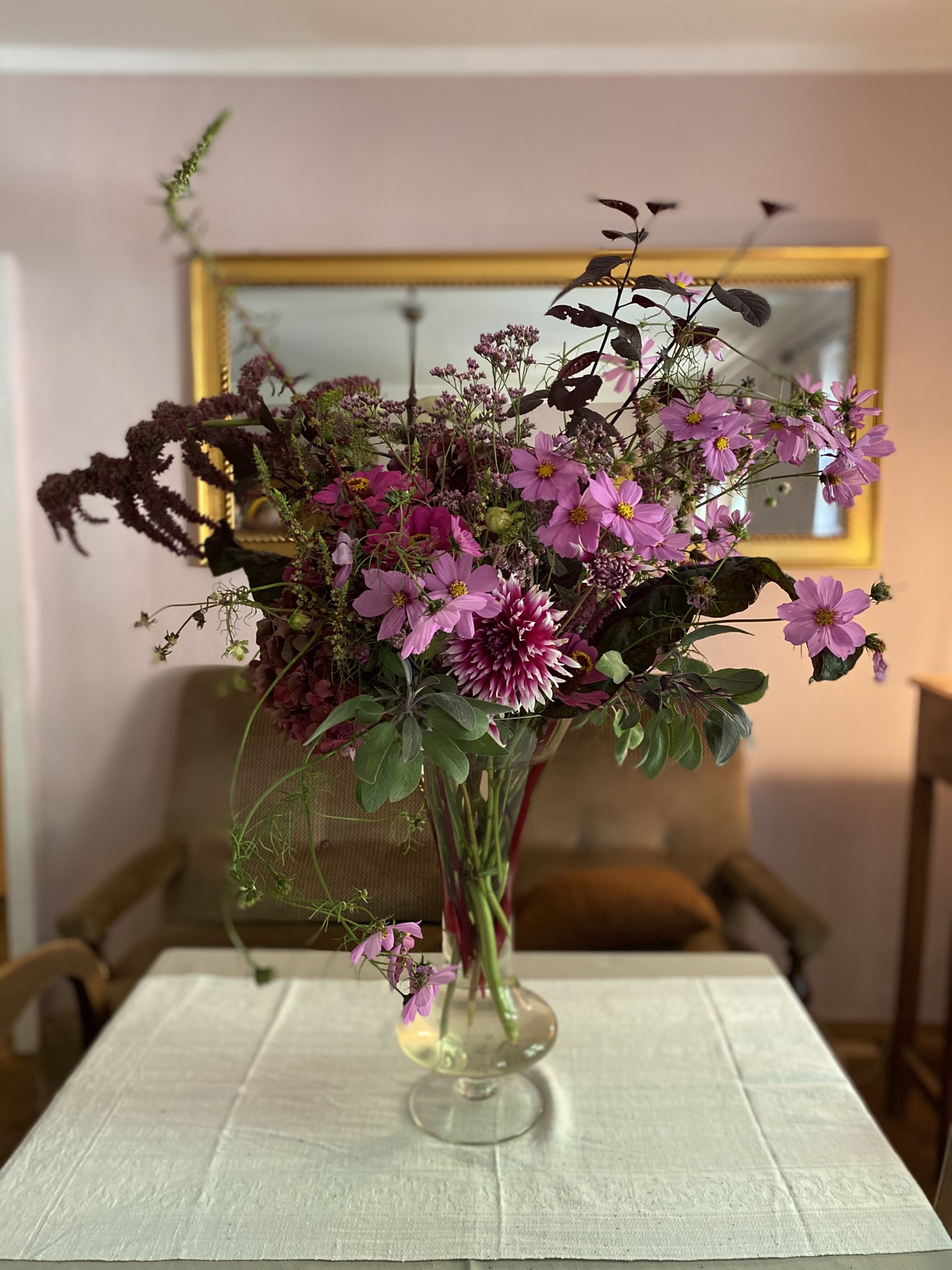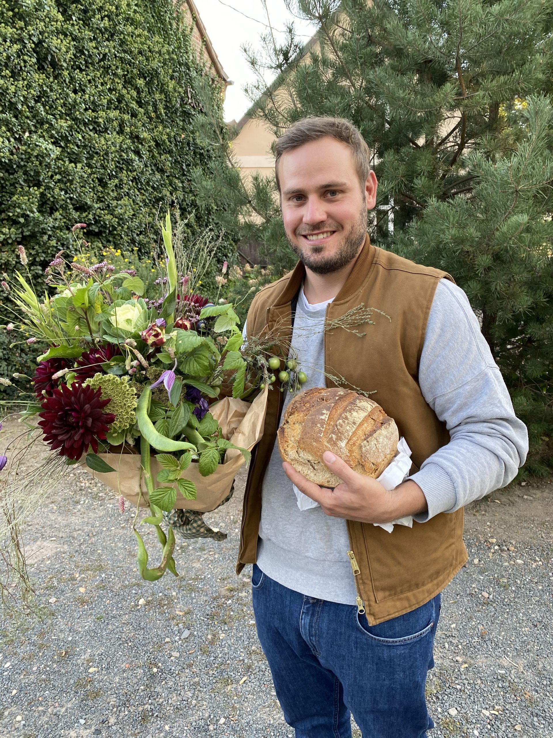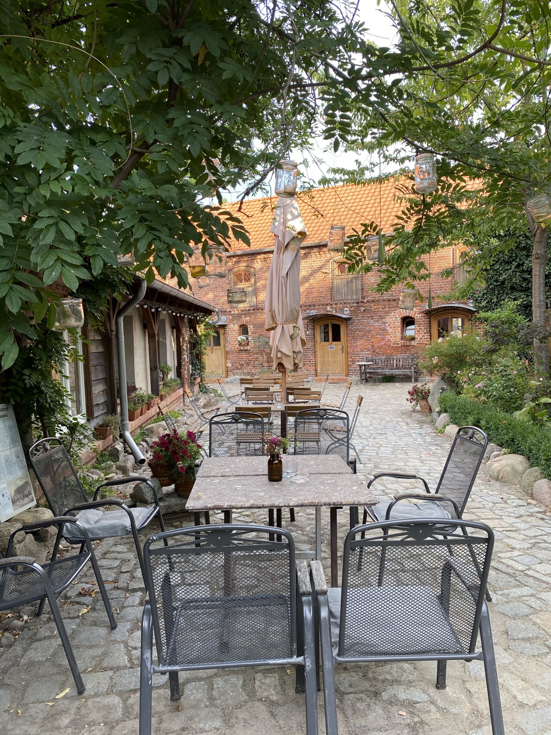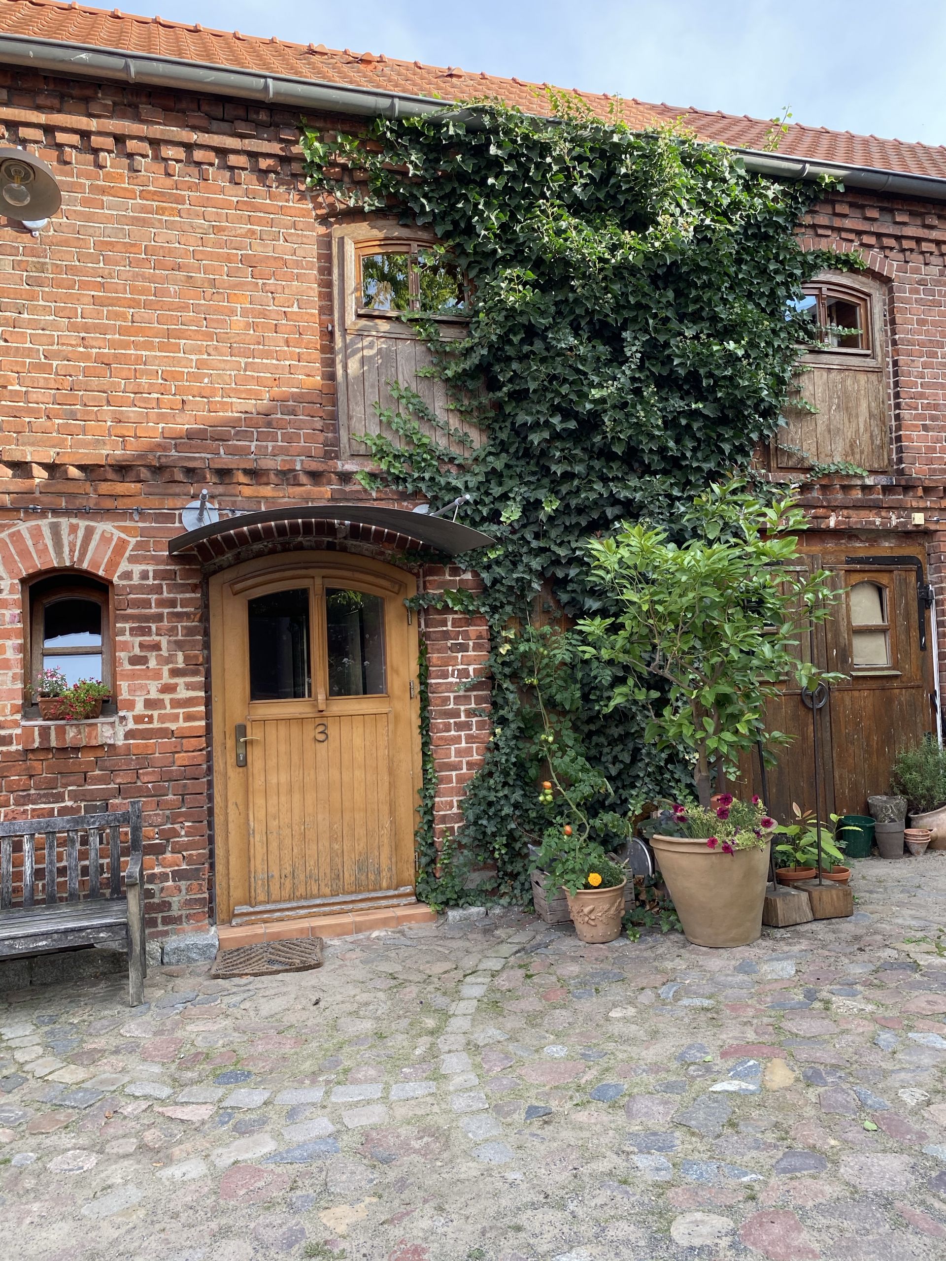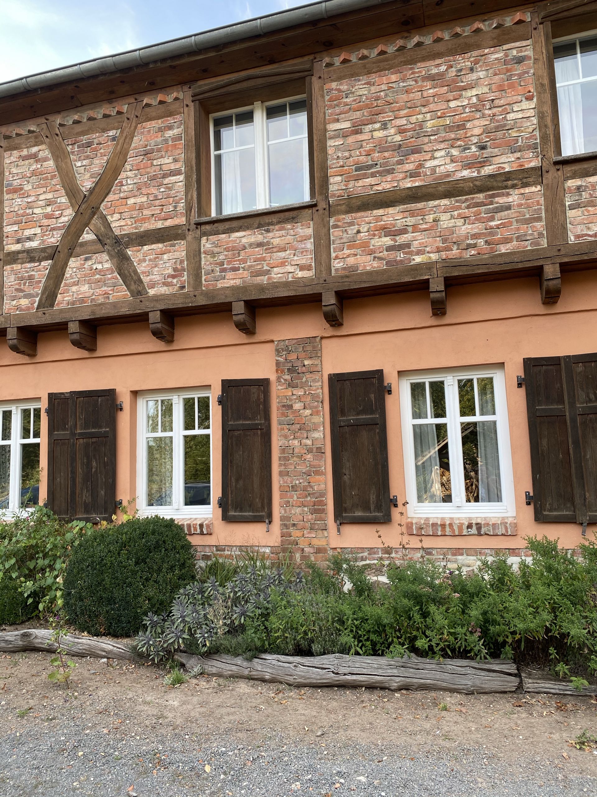 Wir haben hier an Florians Geburtstag einen Laib Brot und einen Strauß gekauft, die uns beiden eine Woche später immer noch Freude machen bzw. schmecken. Unsere Tochter hat derweil mit Begeisterung die Spielecke, den Mühlenteich und die dahinter liegenden Felder samt Kuhweide erkundet. Angesichts des lauschigen Innenhofs mit den dazugehörigen Gästezimmern für maximal 20 Personen kam ich plötzlich auf die Idee, dass Flori und ich nochmal in der nahegelegenen Waldkirche ((*Link) heiraten und dann mit Familie und Freunden feiern müssten. Und zwar genau hier, wo Franziska Richert, ihre Mutter Monika und ihre Schwester, die unglaublich feinfühlige Floristmeisterin Juliane Grützmacher, für so viel Zauber sorgen.