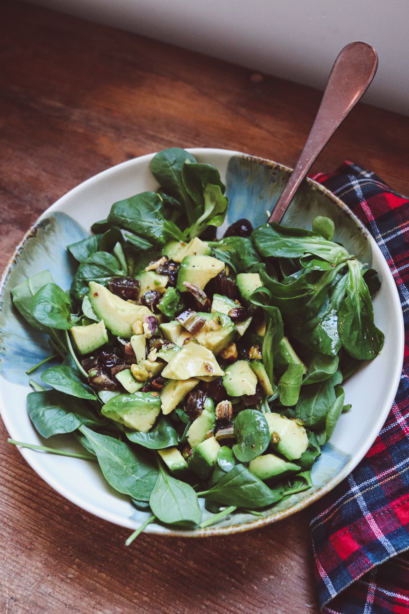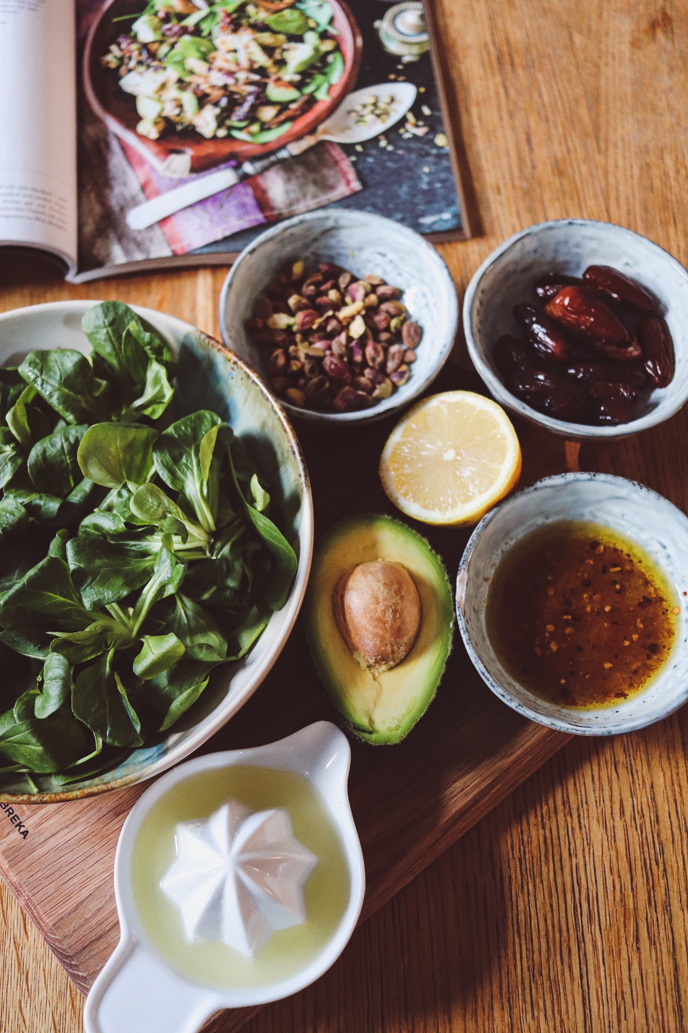 Was mir an diesem Rezept so gefällt: Das Topping wird vorab kurz mariniert. Die Blattsalate dienen sozusagen nur als Bettchen für das sensationelle Techtelmechtel zwischen Avocado, Pistazie und Dattel.