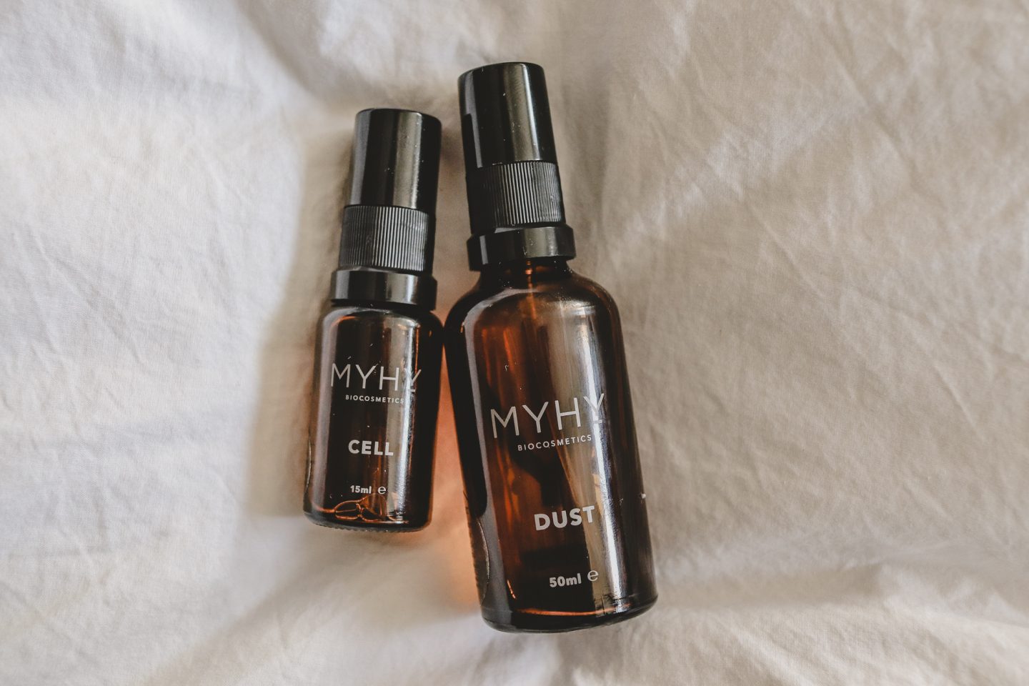 So funktioniert die Anwendung: Zuerst trage ich das Myhy Cell auf das Gesicht und Hals auf und klopfe das Serum vorsichtig ein. Anschließend sprühe ich großzügig das MyHy Dust über die Haut. So entsteht ein Gel, das nach kurzer Zeit vollständig von der Haut aufgenommen wird.