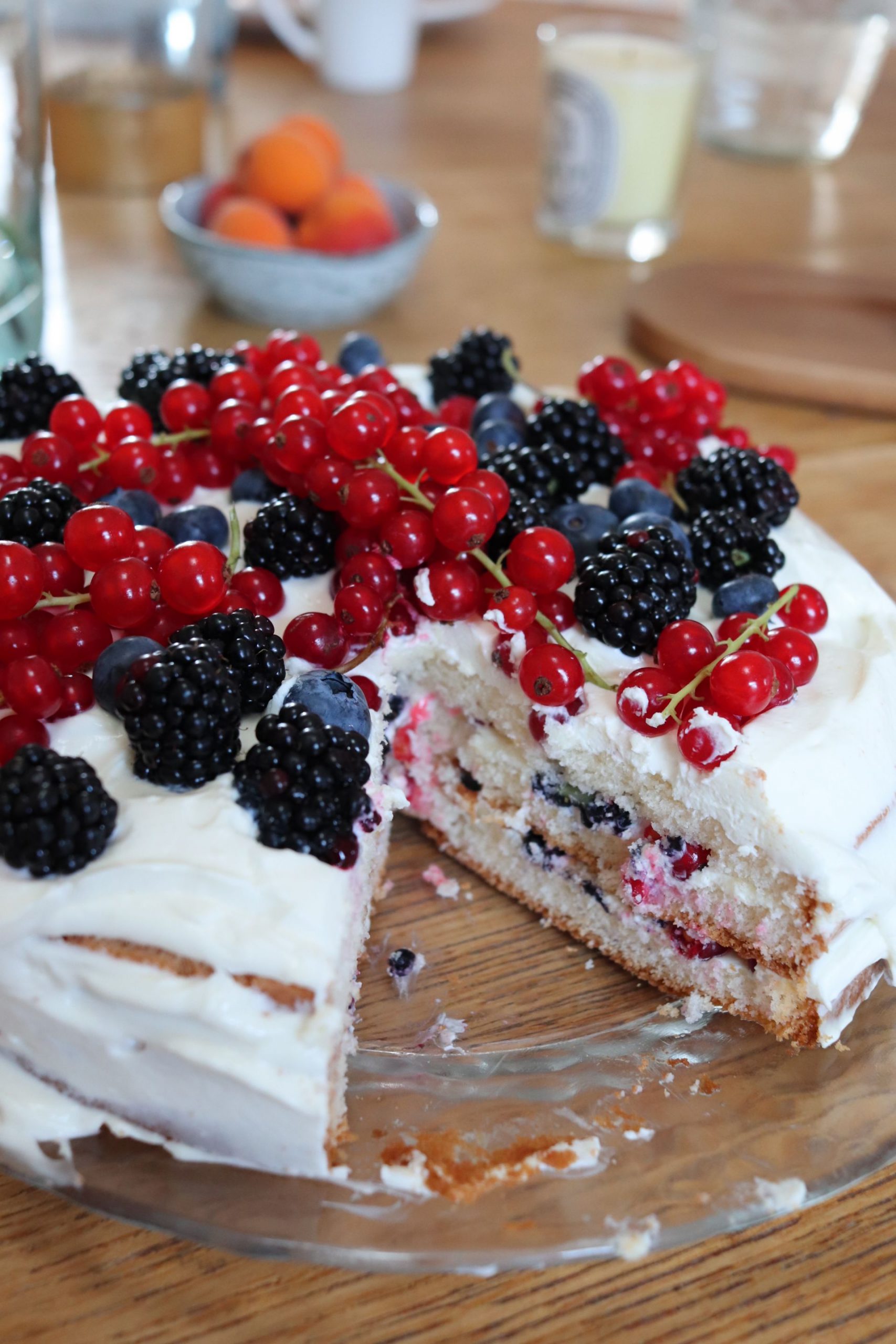 Den dritten Boden auflegen und vorsichtig andrücken. Nun die restliche Creme auf dem gesamten Kuchen verteilen und anschließend mit den restlichen Beeren dekorieren. Wer mag, kann die Creme auch noch mit etwas Zitronenschale oder Eierlikör verfeinern. Dann ist die Torte aber nix für Kinder 🙂