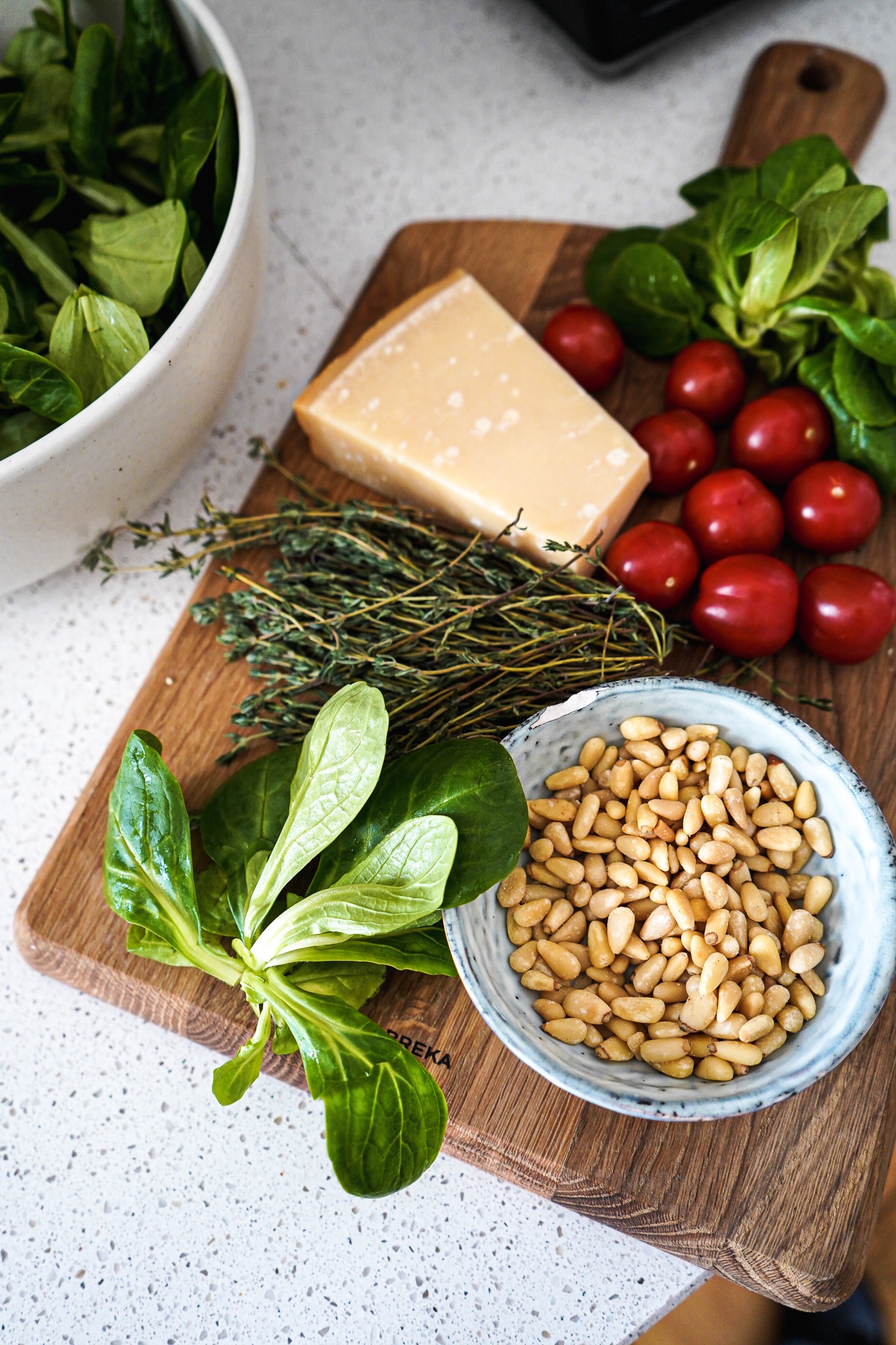 Der „Ich habe nichts im Haus“-Salat: Feldsalat mit gebackenen Tomaten, Parmesan und Pinienkernen