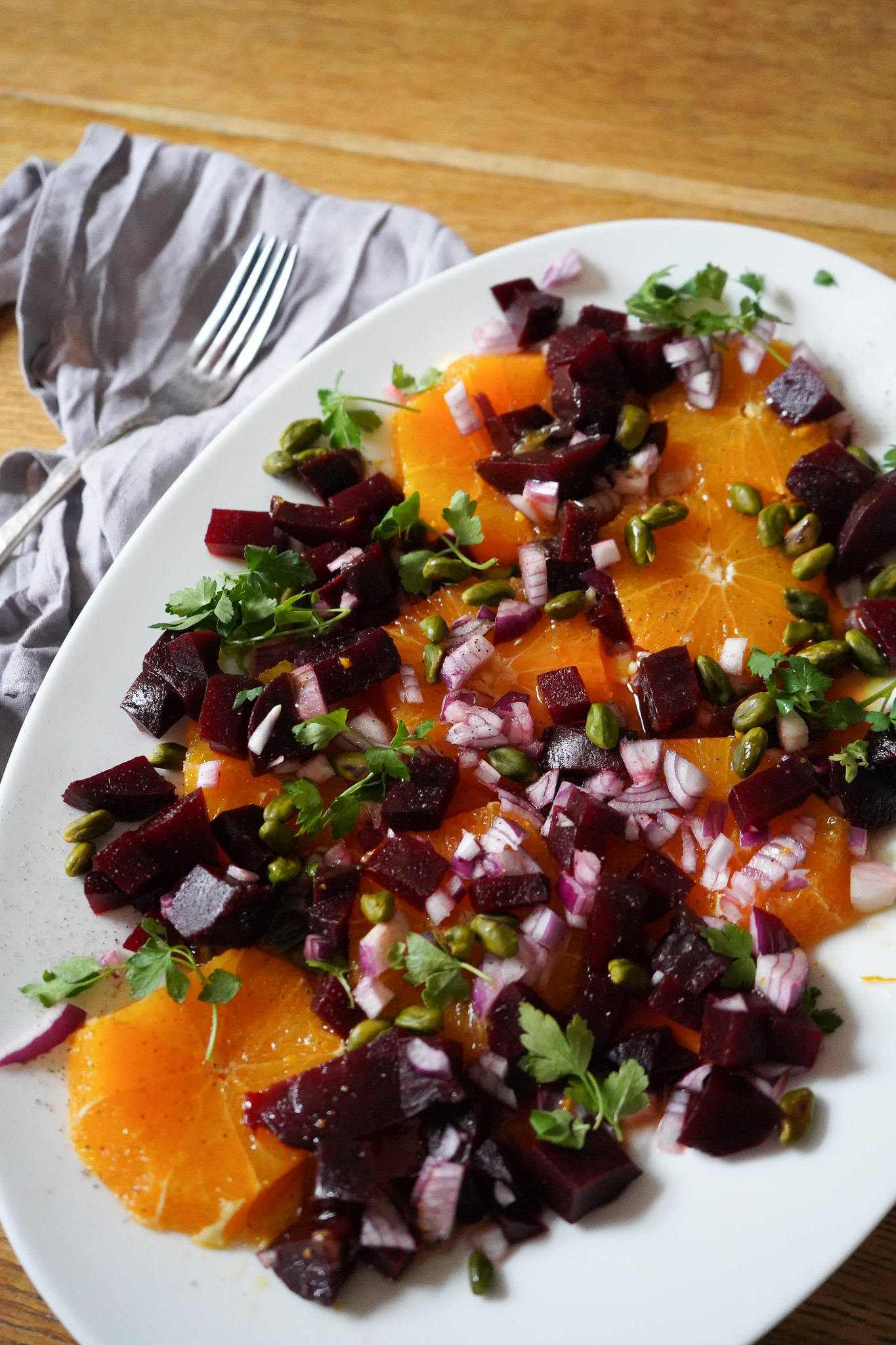 Schöner Salat mit Orangen, Roter Bete und Pistazien
