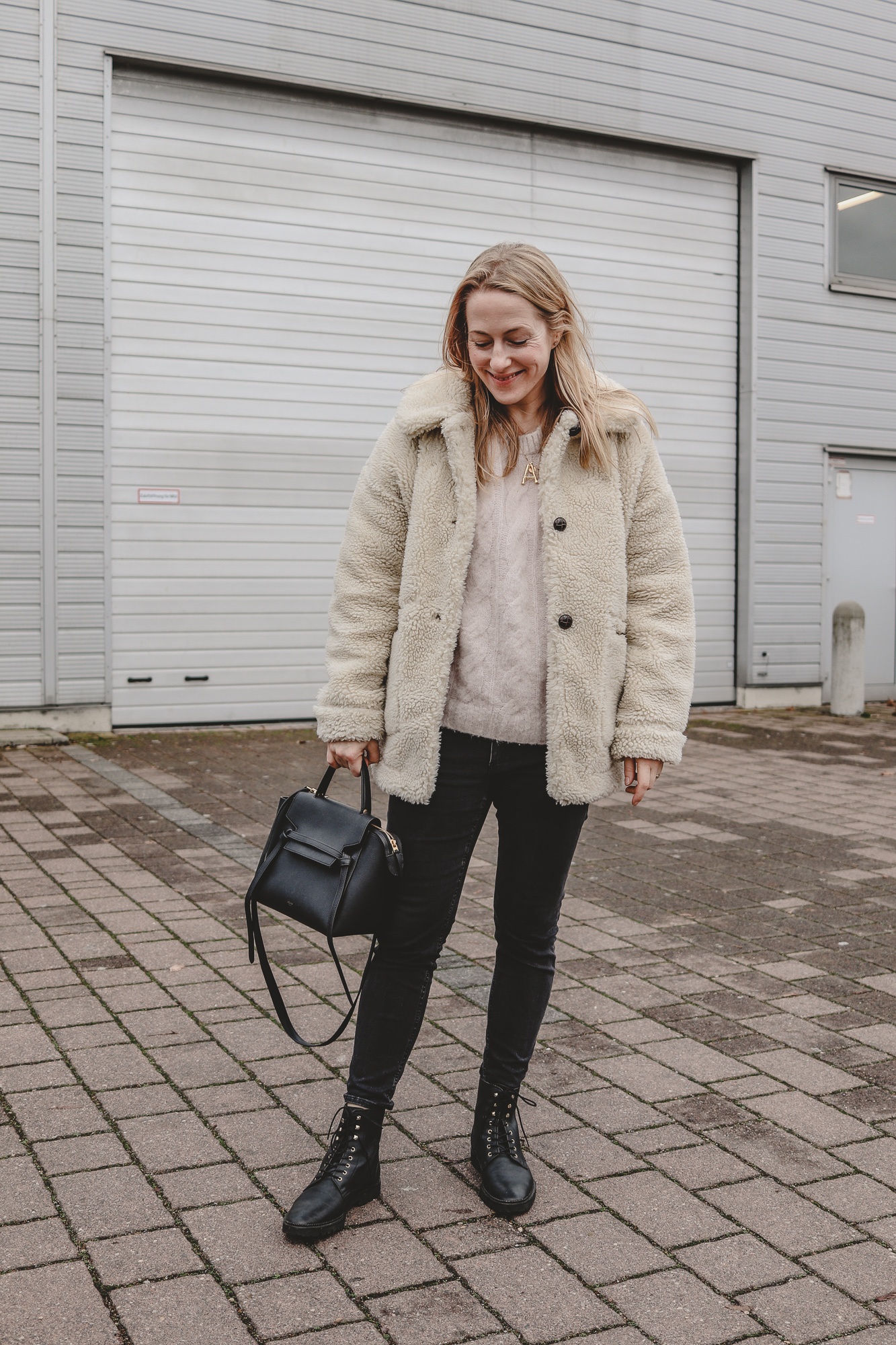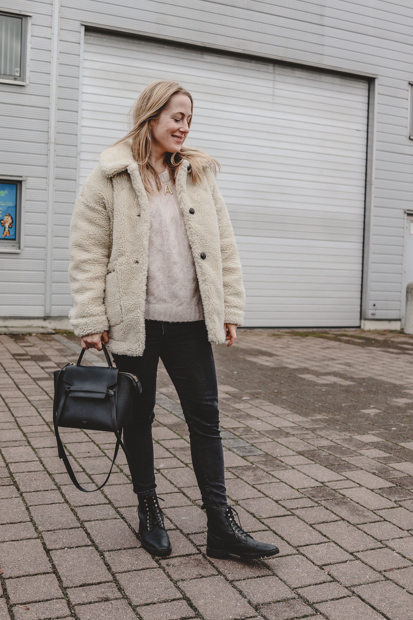Faux Shearling Jacke: Mango, Pullover: Closed (alt), Jeans: Acne Studios, Stiefel: & Other Stories, Tasche: Céline