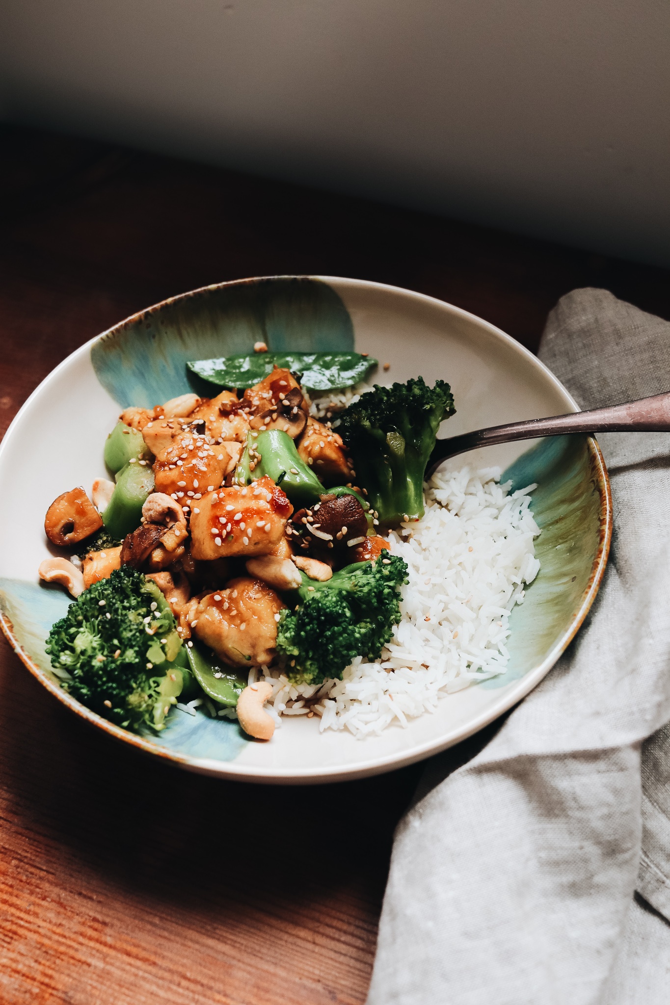 Ein kleines Reisbett auf einen Teller geben. Hühnchen und Gemüse hinzugeben. Mit Cashewnüssen, Sesam und – wer mag – frischem Koriander bestreuen und mit 1/4 Limettenspalte servieren.