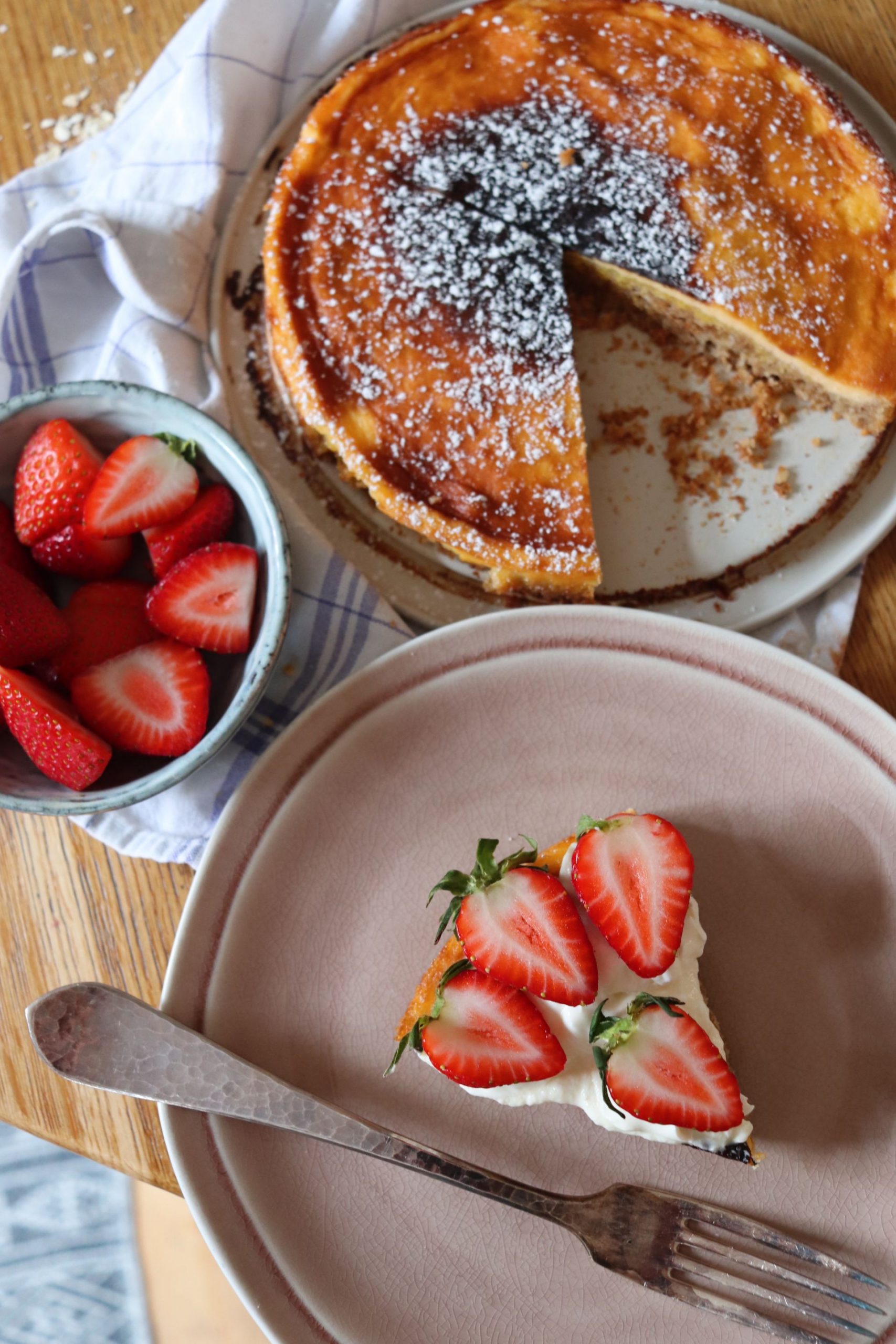 - Den Kuchen dem Ofen nehmen und auf einem Kuchengitter vollständig abkühlen lassen. Anschließend am besten über Nacht in den Kühlschrank stellen. Eine Stunde vor dem Servieren aus dem Kühlschrank nehmen. Die Kruste mit Puderzucker bestäuben. Mit frischen Erdbeeren, Crème fraîche oder Schlagsahne servieren.