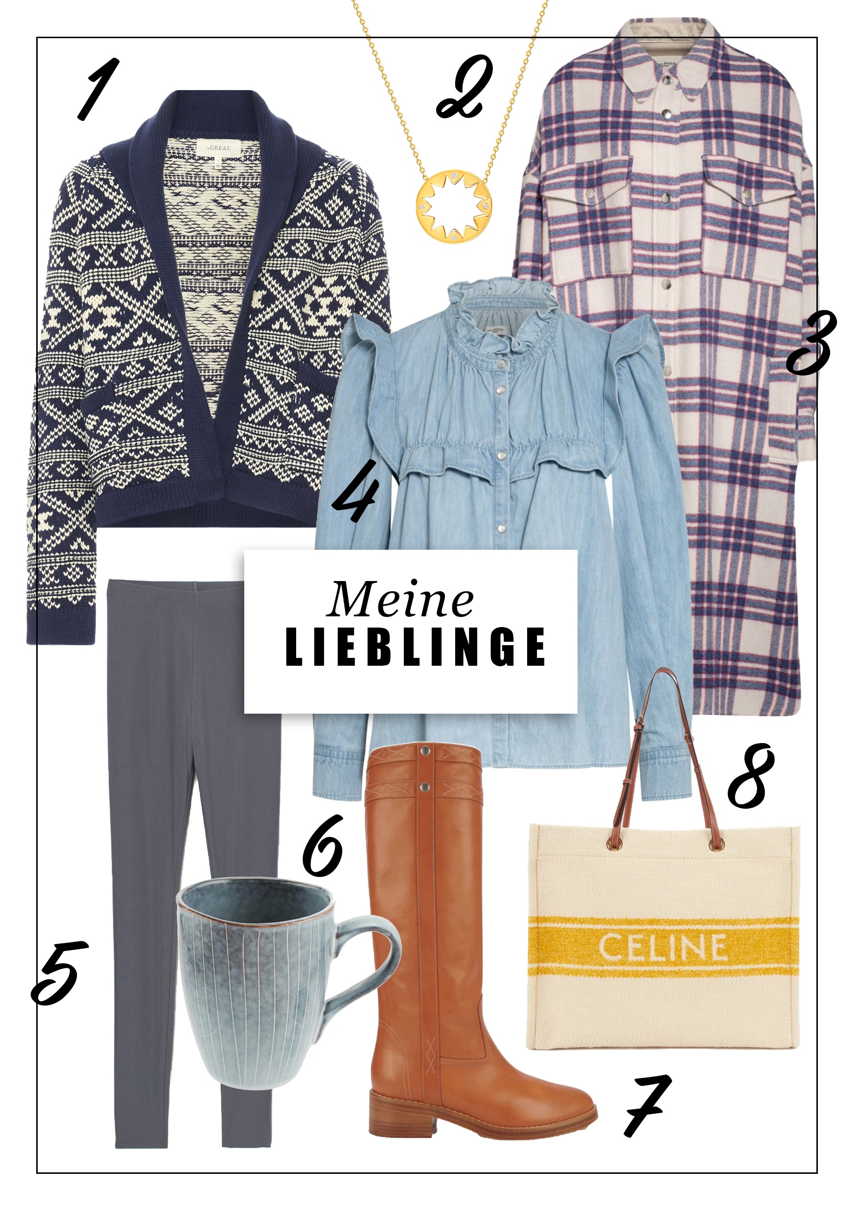 *Affiliate LinksCardigan: The Great, Bluse: Etoile Isabel Marant, kariertes Overshirt: Etoile Isabel Marant, Leggings: Girlfriend Collective, Schuhe: Celine, Kette mit Sonnenanhänger: Mosuo, Tasse: Broste Copenhagen