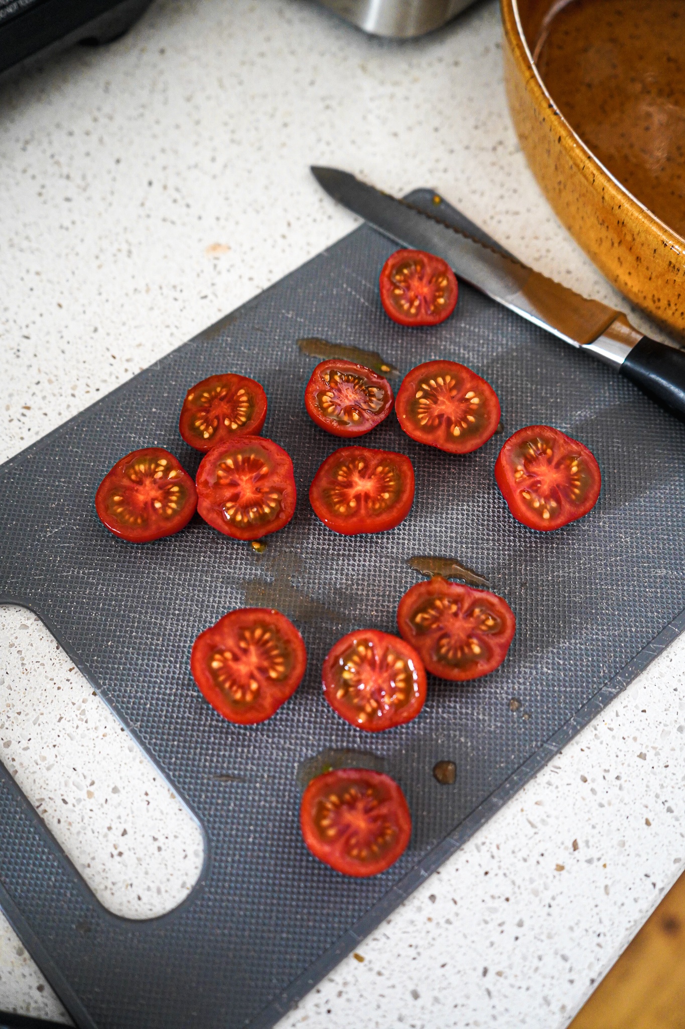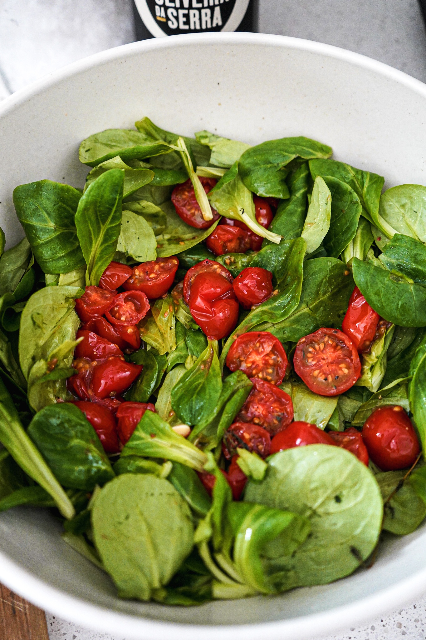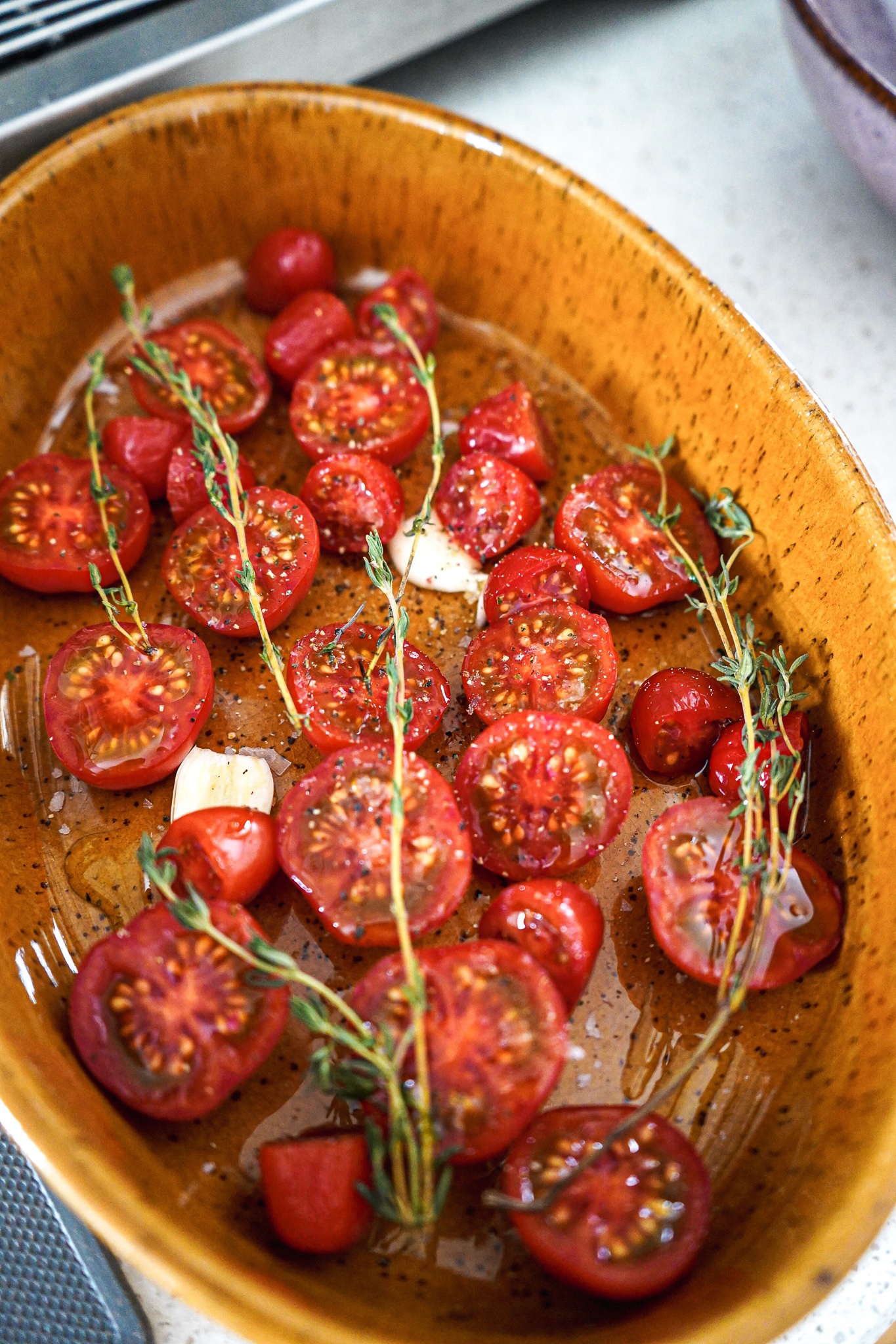 Feldsalat gut waschen und in der Salatschleuder trocken schleudern. Tomaten waschen und quer, nicht längs, halbieren. Olivenöl in die Ofenform geben. Die Tomaten ins Öl setzen. Salzen. Knoblauch pellen, halbieren und dazu geben, ebenso wie die Kräuterzweige. Ofen auf 200 Grad stellen. Die Tomaten 10 Minuten backen, bis sie etwas zusammenfallen und sich auf dem Boden Flüssigkeit bildet – das ist nämlich das Dressing für den Salat.