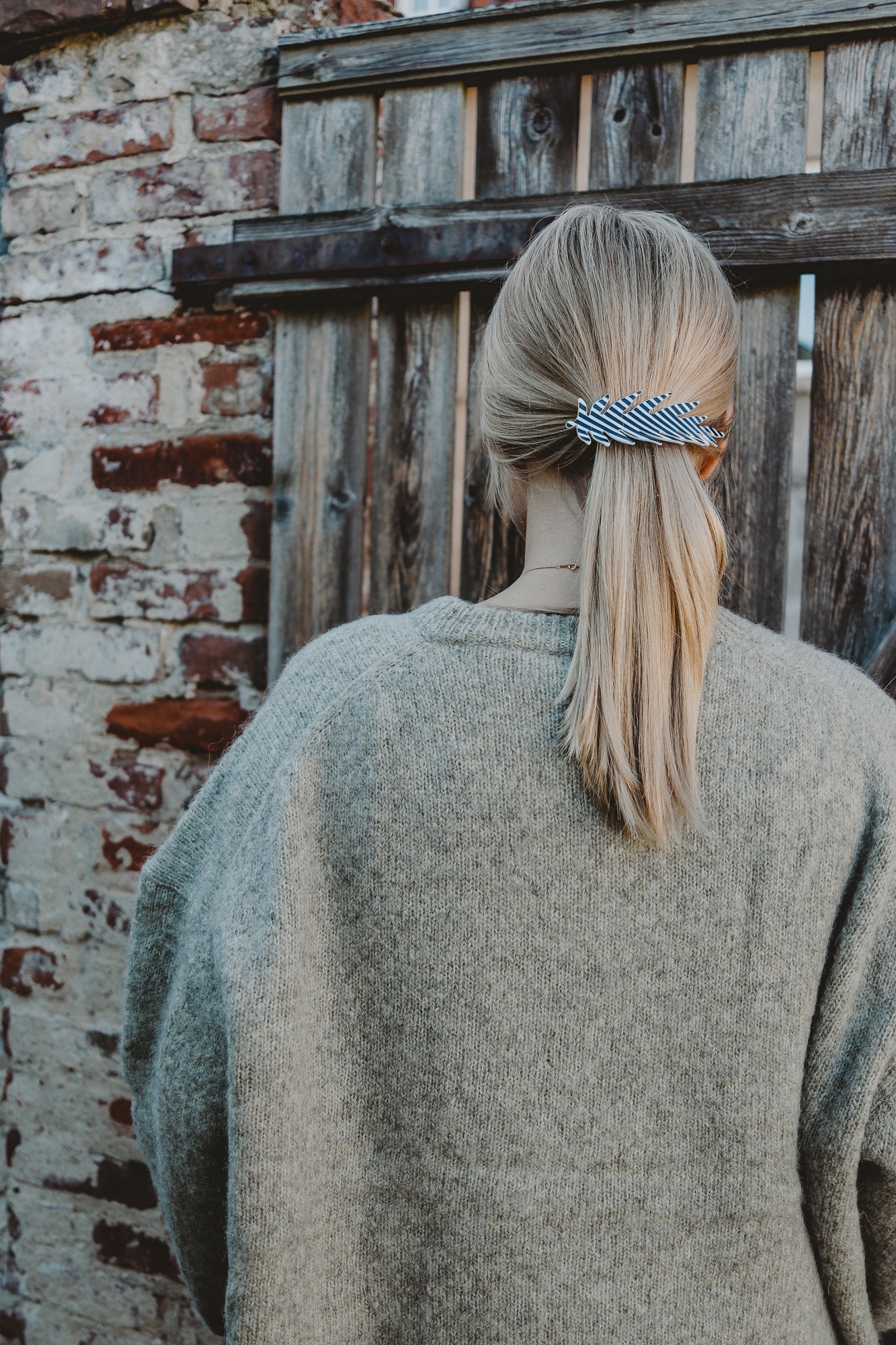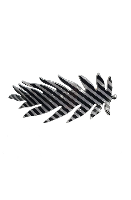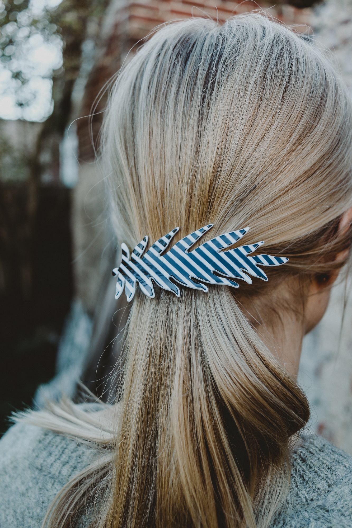 Ich musste mir gleich zwei Modelle sichern und trage sie seitdem abwechselnd nonstop: die große Haarspange „Leafy Stripe Black White“ und die kleine Petit Leaf Crystal White Leo: