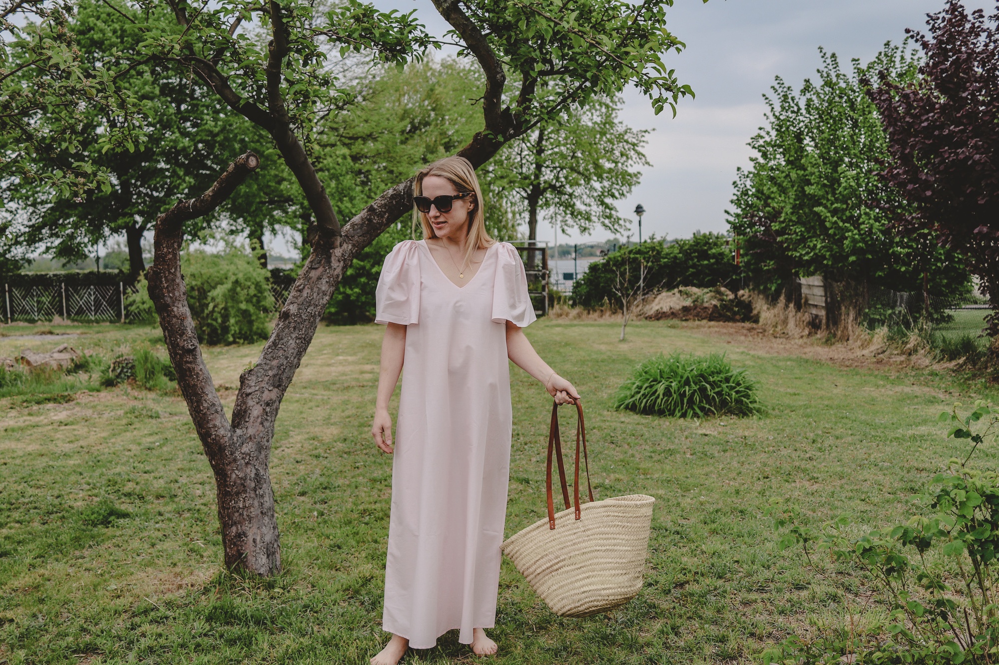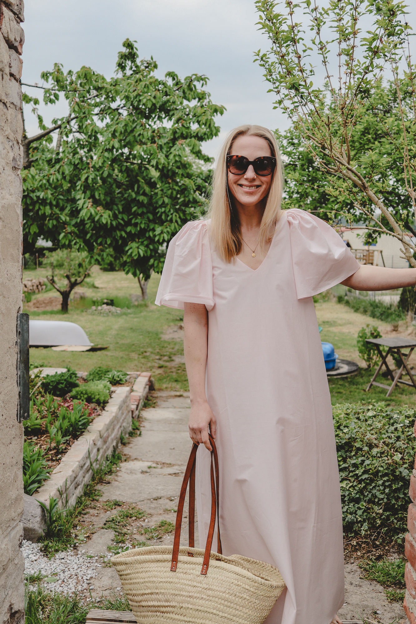 Kleid: Kuvert Berlin (PR-Geschenk), Tasche: auf Ibiza gekauft, Sonnenbrille: Céline, Kette: Annilu