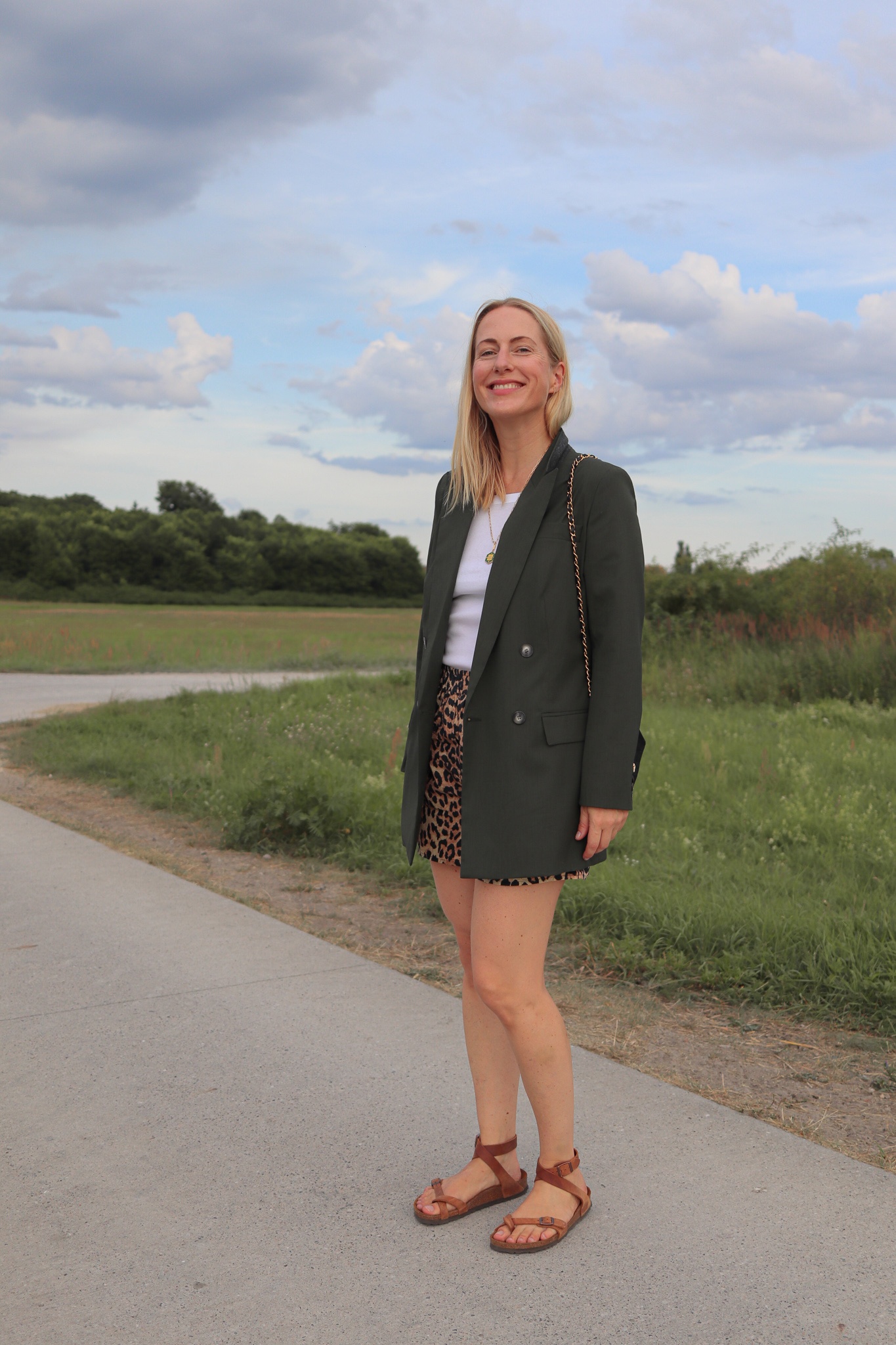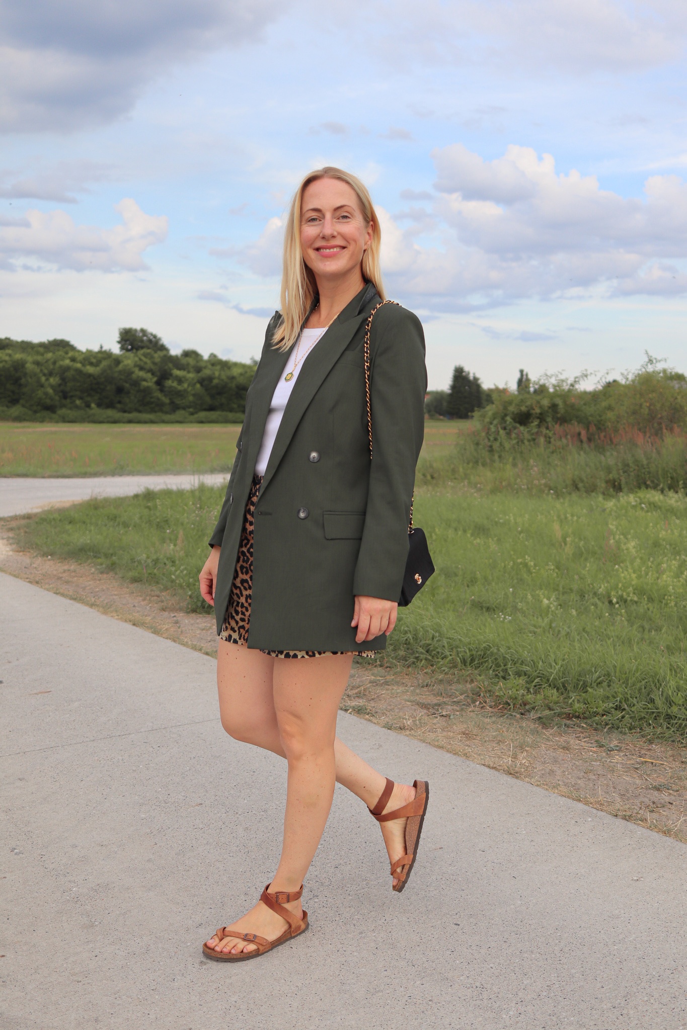 Geht denn ein Blazer überhaupt im Sommer? Und wie! Die Jacke funktioniert super mit meinen geliebten Leo-Shorts, auch wenn ich diesen Look vorher unter „No Go“ abgespeichert hatte. Das gilt aber nur dann, wenn man die kurzen Hosen mit High Heels kombiniert. Das sieht meiner Meinung nach prollig aus. Mit Birkenstocks aber ist die Kombi Blazer + Shorts ein Knüller!
