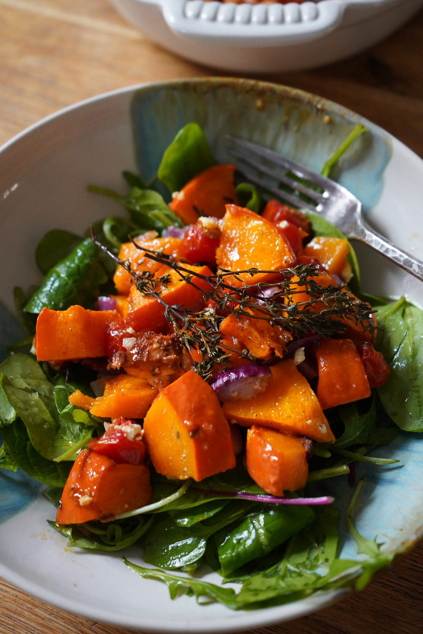 2 EL Olivenöl in eine Auflaufform (unsere ist die „Ovale Auflaufform Tradition aus Steinzeug“ von Le Creuset) geben. Kürbis, Tomaten und Zwiebel darin anrichten. Feta klein schneiden oder mit den Händen über das Gemüse krümeln. Salzen und pfeffern. Thymianzweige darüber legen. Abermals 1-2 EL Olivenöl darüber geben. Im Ofen für 10-20 Minuten backen. Der Käse sollte weich sein, der Kürbis bissfest.