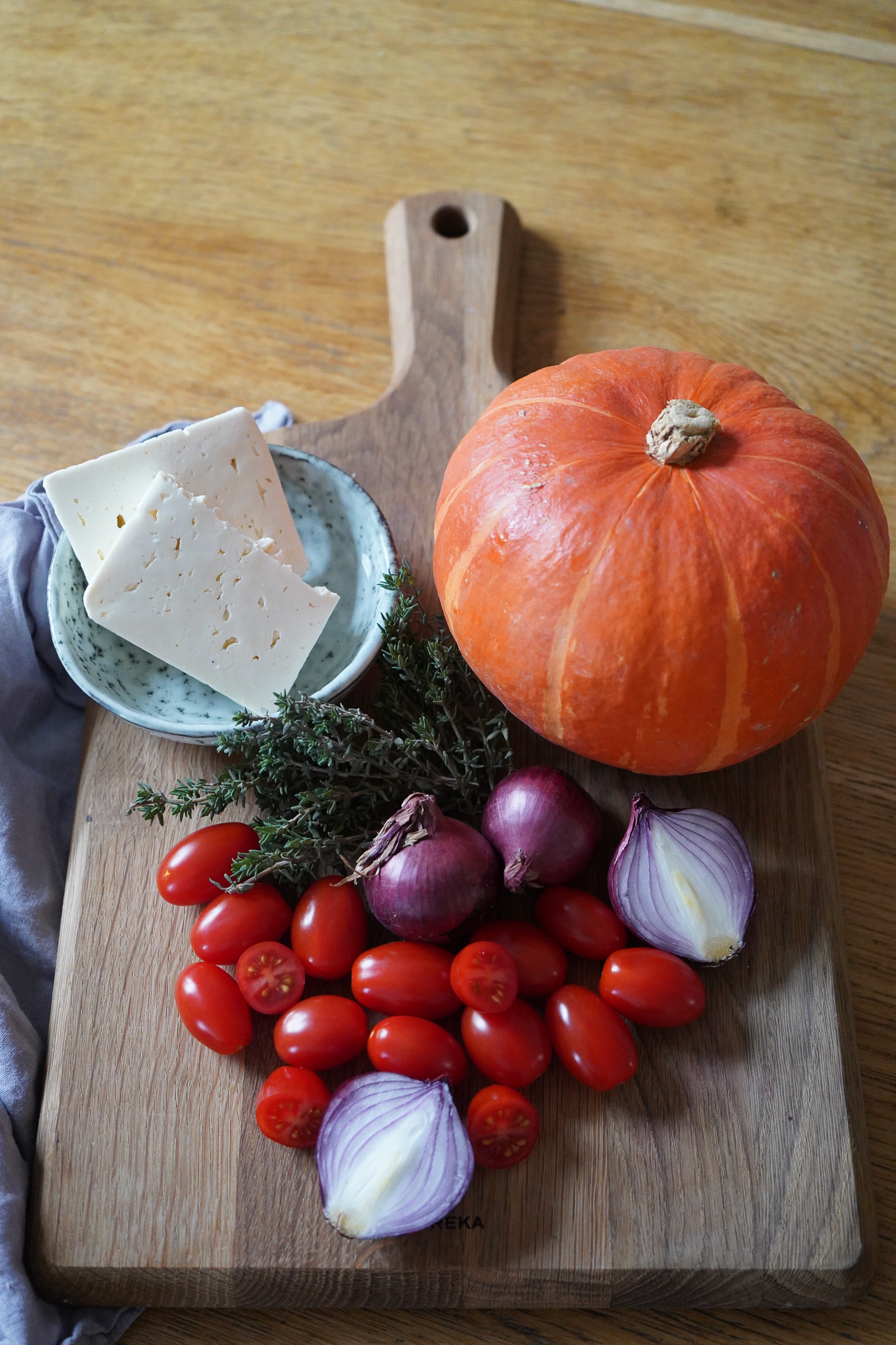 Kürbis waschen, halbieren, entkernen und in mundgerechte Stücke schneiden. Tomaten waschen und quer halbieren. Rote Zwiebel enthäuten, halbieren und in Streifen schneiden. Feta abtropfen lassen.