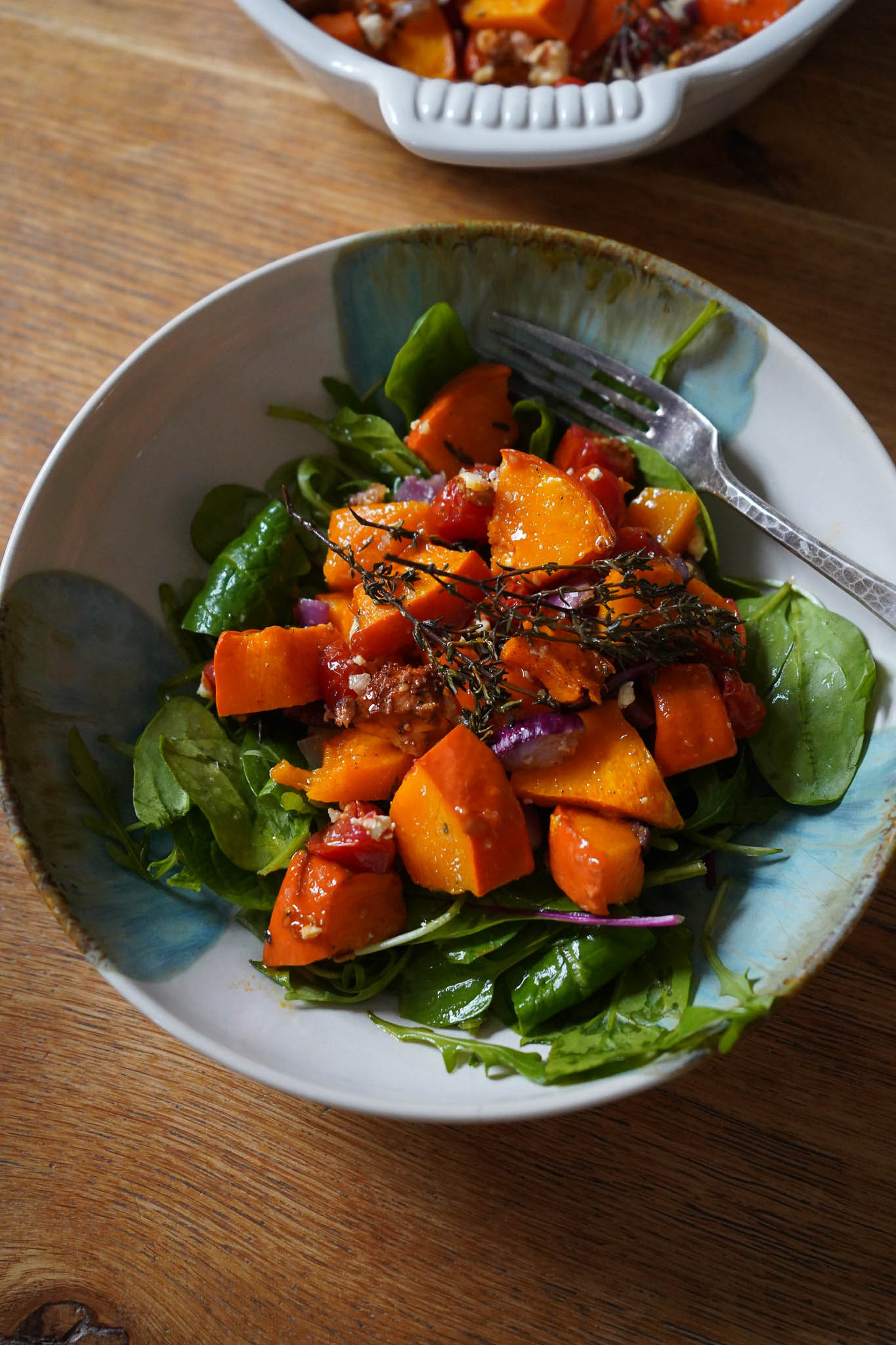 Für jeweils eine Person in einem Teller die gemischten Blattsalate ausbreiten. Mit 1 EL Essig, Prise Meersalz, Spritzer Kokos Aminos und 1 EL Olivenöl „anmachen“. Ofengemüse darüber geben. Das ist der 1. Salat! Wenn ihr mehr Hunger habt, dann könnt ihr das alles jetzt noch mit gekochtem Quinoa und Walnüssen tunen. So lecker geht’s in diesem Jahr weiter.