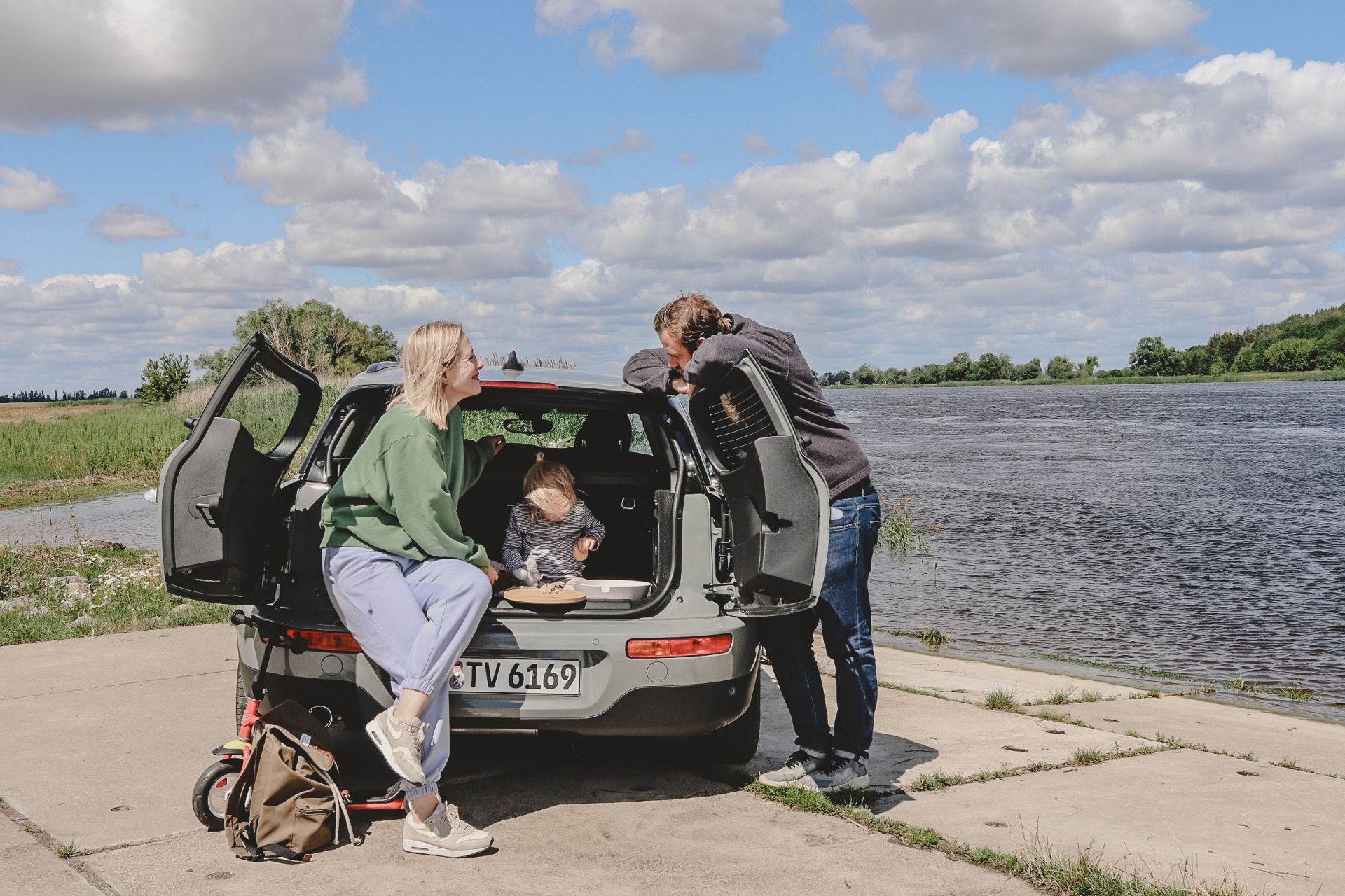 Unvergeßliche Eindrücke: Das Picknick im Kofferraum des MINI Clubman mit geöffneten Splitdoors an der Fähranlegestelle zwischen Gozdowice und Güstebieser Loose und das älteste Kolonistendorf Neulietzegöricke, ein charmantes Örtchen mit denkmalgeschützten Fachwerkhäusern – wie aus einem Bilderbuch. Tipps: Kaffee & Kuchen im Kolonisten-Kaffee oder in der Dorf-Gaststätte Zum Feuchten Willi einkehren.