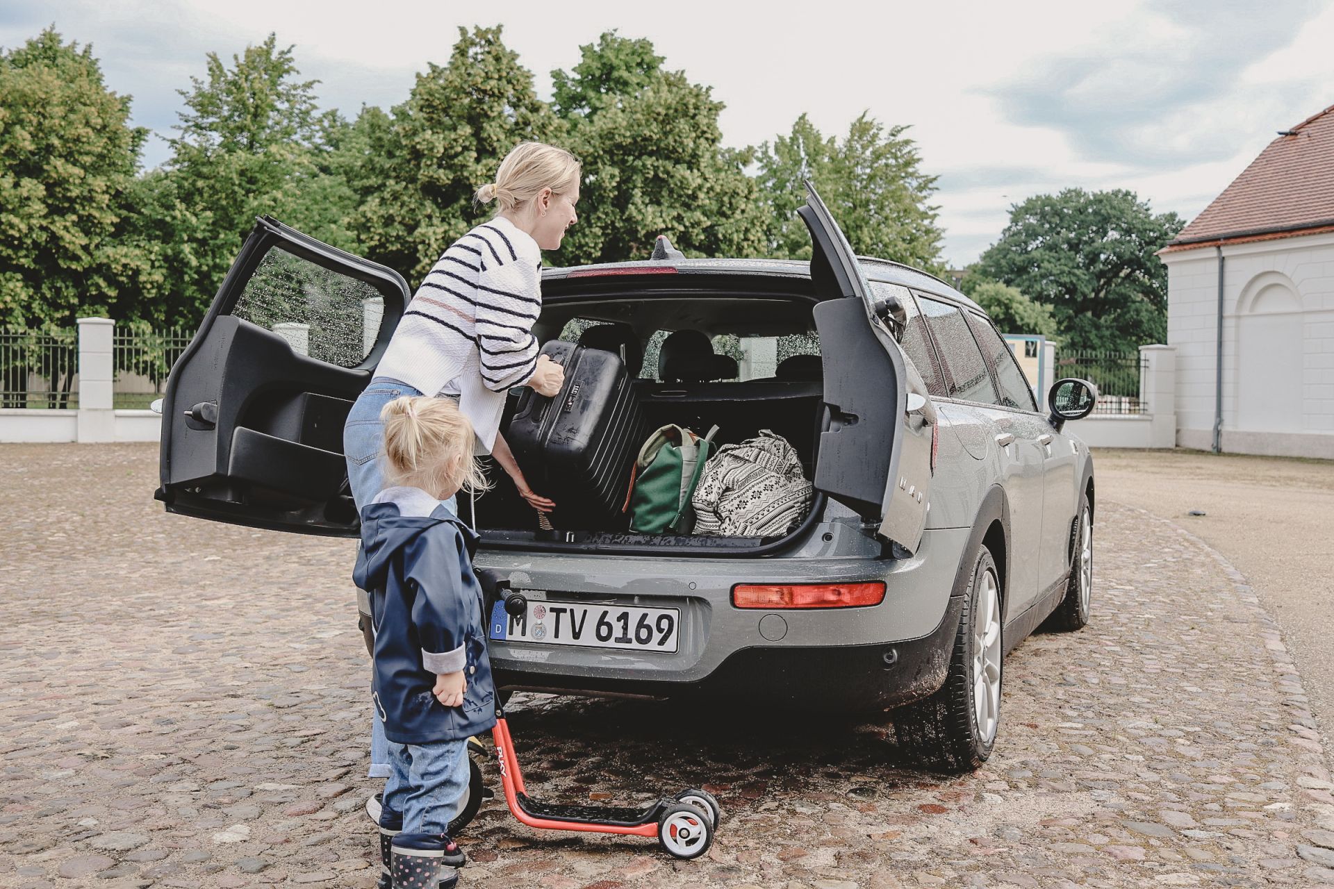 Danach haben wir zuhause das Auto für unseren Kurztrip gepackt: Koffer, Taschen, Kleidersäcke, Schuhe, Roller, Kinderwagen, Bücher, Spielzeug und Proviant – bei uns kommt schnell ein Berg von Gepäck zusammen, der gut verstaut werden muss, aber in den MINI Clubman passt jede Menge rein, sodass kein Stress aufkam.