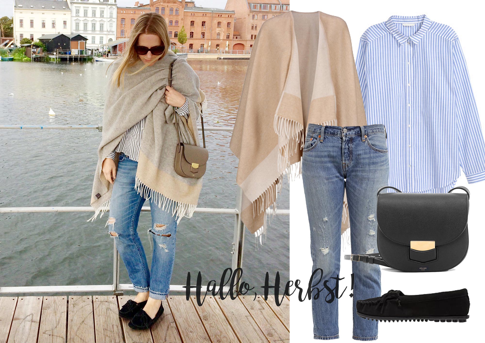 Cape: Das Cape Mädchen (in Beige hier oder hier) || Jeans: Levi’s 501 CT || Bluse: H&M (hier in Hellblau-Weiss) || Schuhe: Minnetonka Kilty || Sonnenbrille und Tasche: Céline