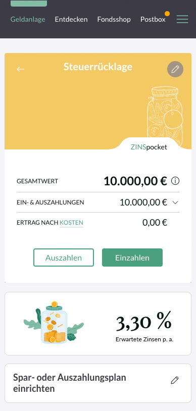 Andere Banken locken mit mehr Zinsen, aber diese Angebote gelten meisten nur für Bestandskunden, sind an hohe Anlagesummen gebunden oder maximal für sechs Monate gültig – dann setzt die Bank die Zinsen wieder runter. Das Evergreen ZinsPocket bietet einen erwarteten Zinssatz von 3,30 % pro Jahr – ohne das Risiko einer Geldanlage, Laufzeitbegrenzung oder einer Mindest- oder Maximalhöhe der Anlagesumme. Zinsen ohne Wenn und Aber sozusagen.