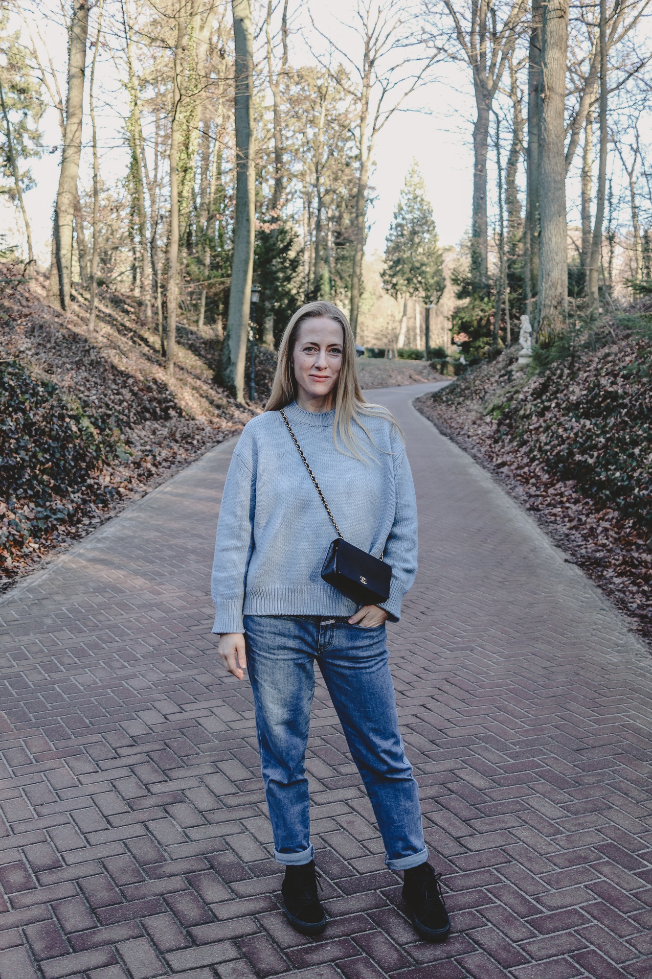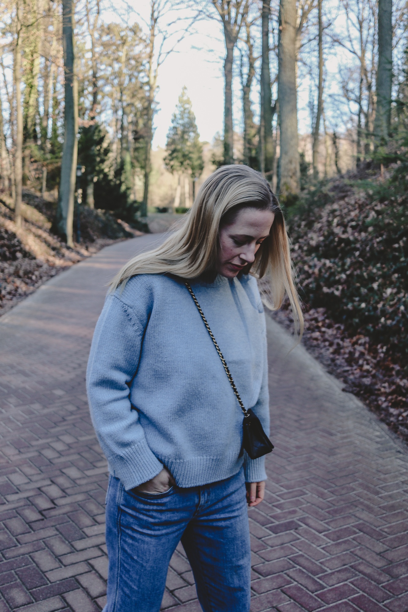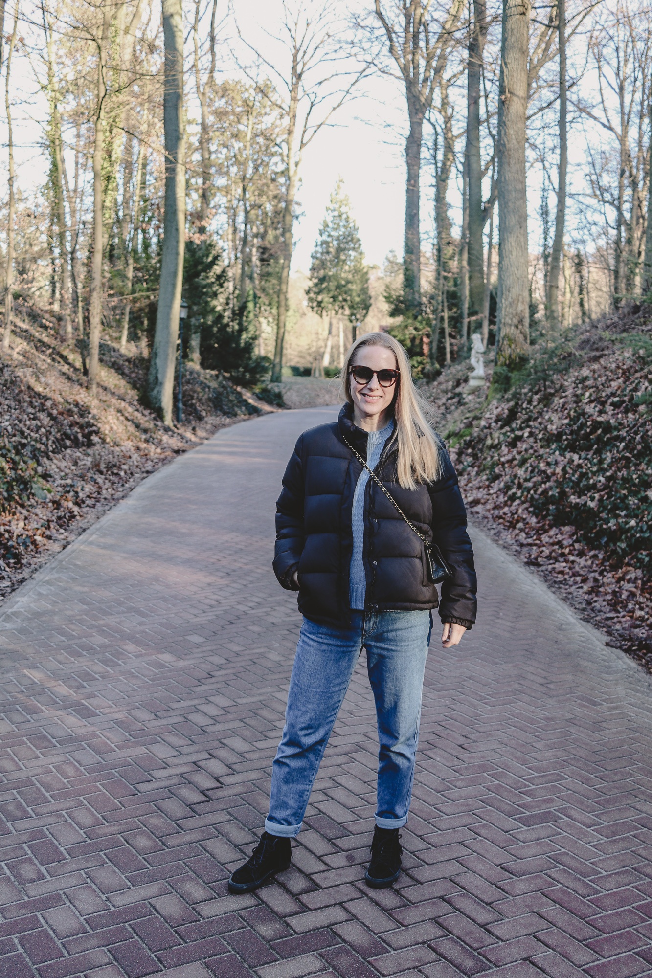 Sonnenbrille: Céline, Jacke: Samsoe & Samsoe, Pullover: Mansur Gavriel, Jeans: Closed, Tasche: Chanel Vintage, Schuhe: Vans (alt)