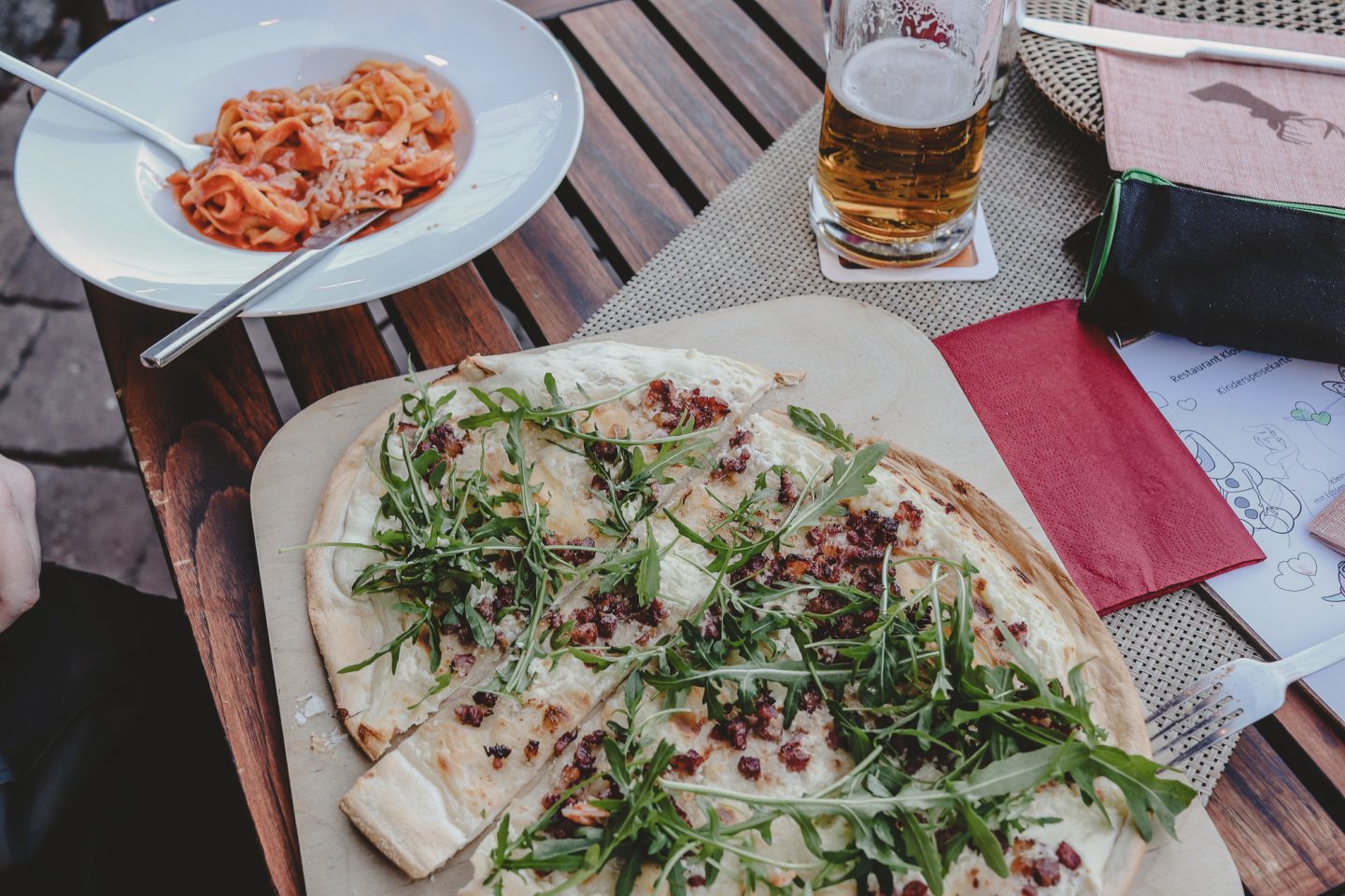 Dafür haben wir uns allerdings nicht direkt im Hotel, sondern in einer gemütlichen Ferienwohnung („Zirbelwohnung“, ca. 120 Euro/Nacht) auf dem Gelände eingemietet. Ein Hotelzimmer wäre zu teuer gewesen und das Apartment war vollkommen ausreichend für uns, wenn auch nicht besonders luxuriös. Trotzdem: Ein großes Wohnzimmer unter dem Dach, zwei Schlafzimmer und Bäder sowie eine kleine Küche waren perfekt für uns, um in Ruhe zu duschen, morgens den Kinderkanal zu schauen und die nächtliche Milchflasche für Baby Peng zuzubereiten.