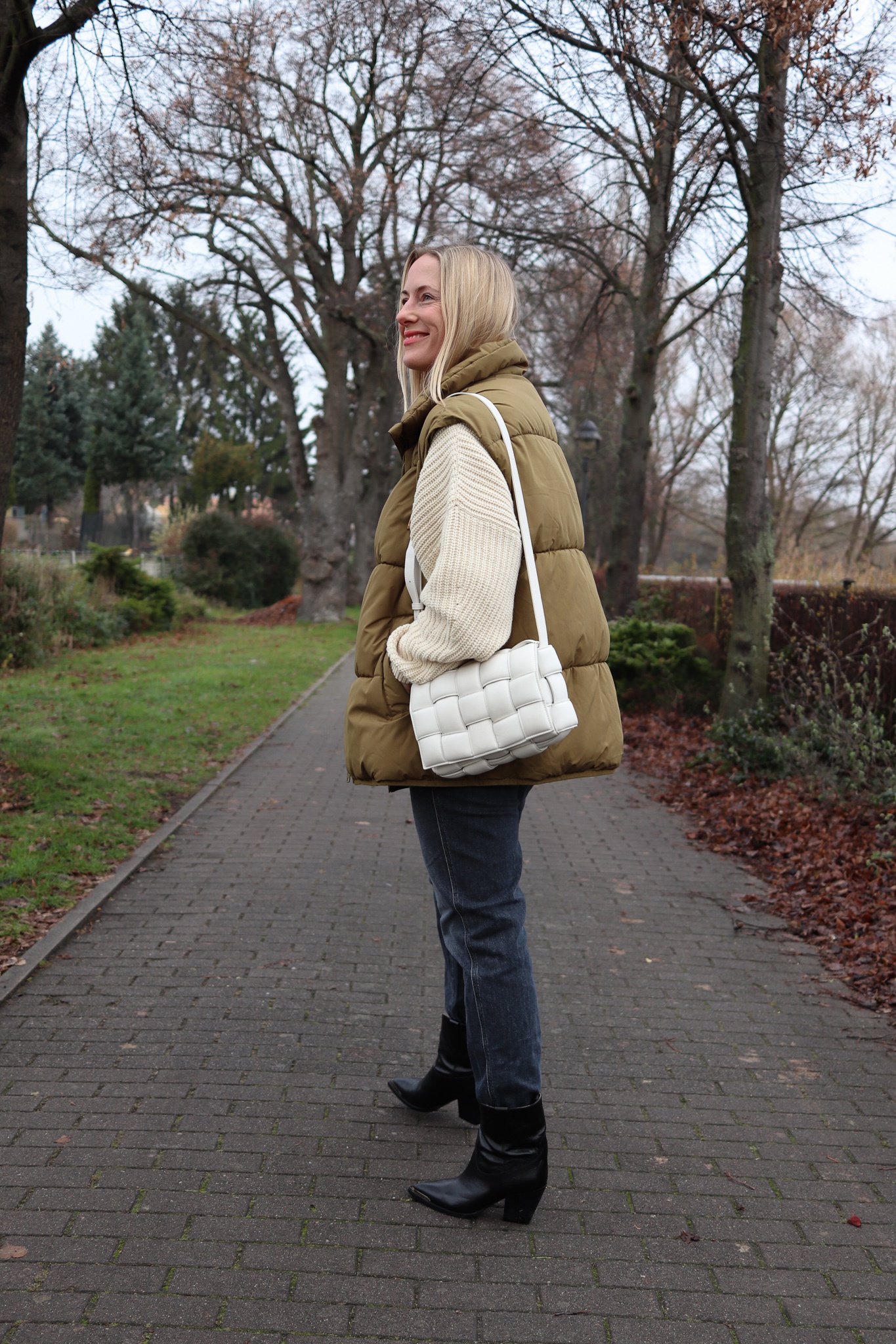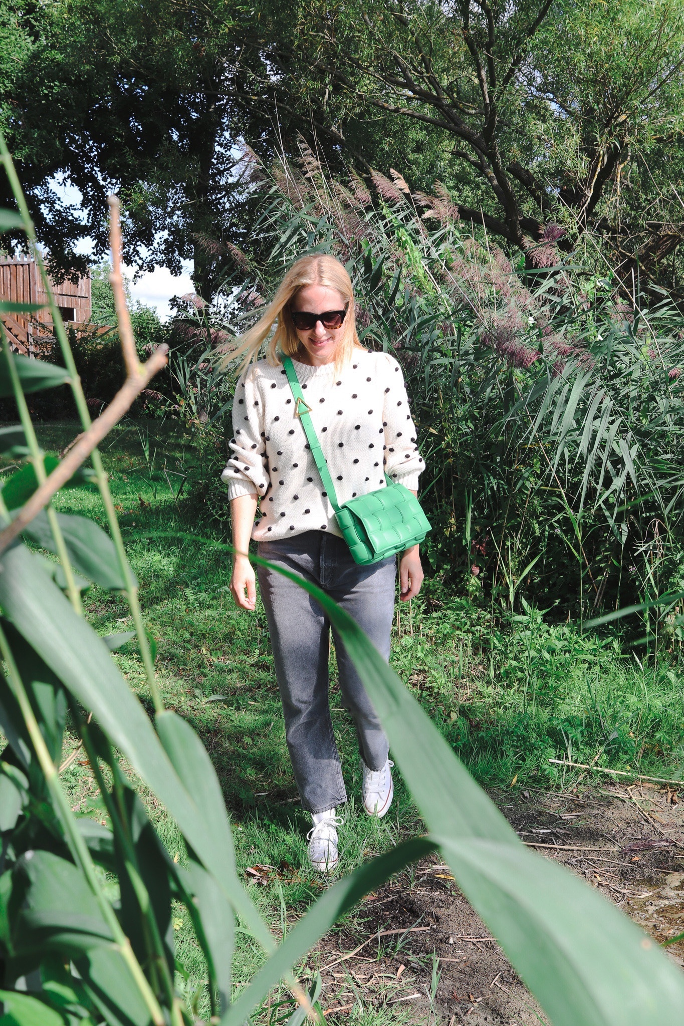 Mein zweiter Favorit ist die Bottega Veneta Padded Bag, wegen der knalligen Farbe. Dieses Grün hat so gute Laune gemacht und war überraschend einfach zu kombinieren! Hätte ich das Abo nicht gehabt, hätte ich niemals diese Erfahrung gemacht. Insofern finde ich super, dass man im Rahmen des Abos die Taschen eine Weile Probe tragen kann. Was ich so auch festgestellt habe: In die Bottega passt kaum etwas rein. Anders als in das Platzwunder von Gucci.