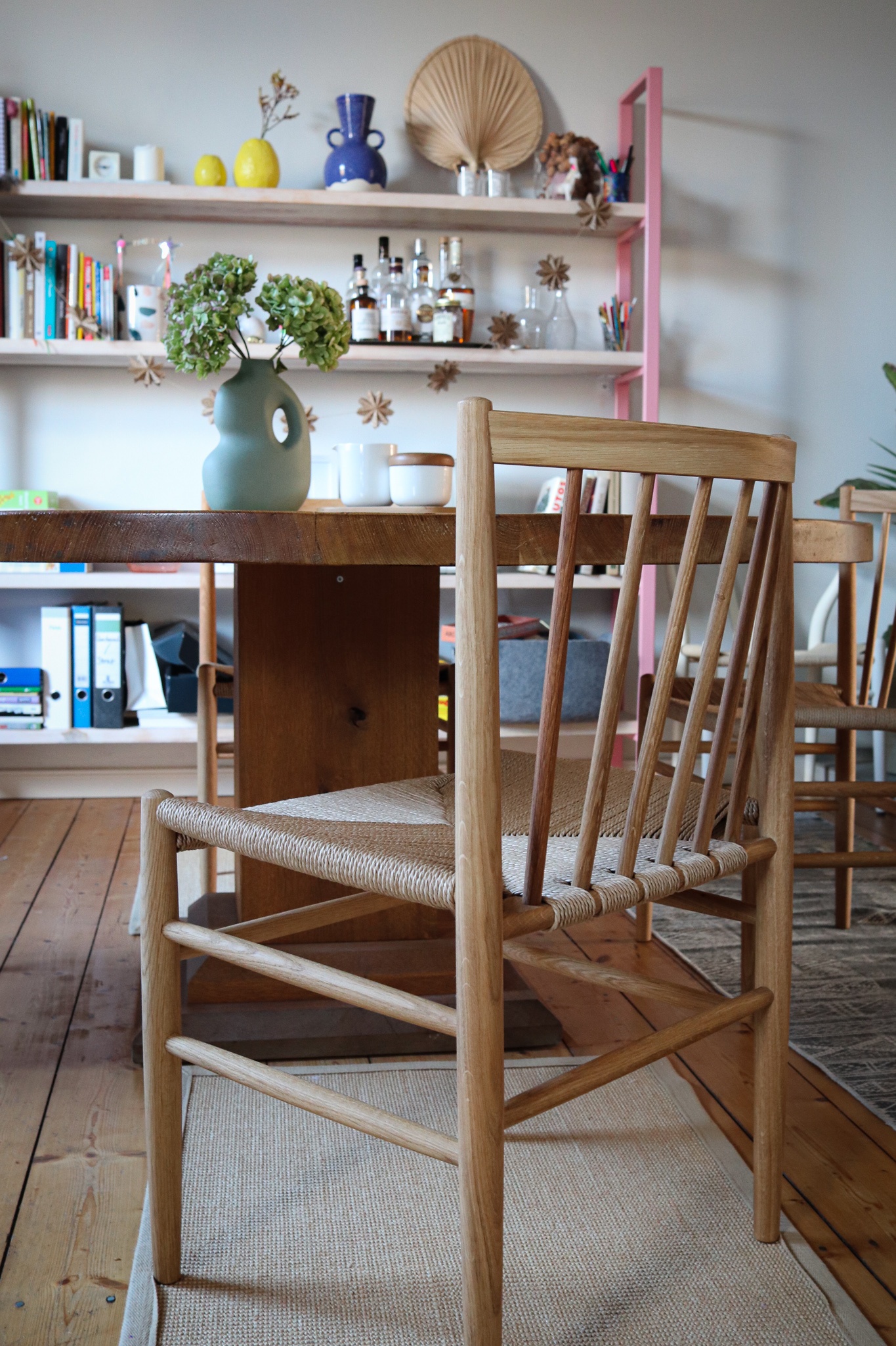 Und sind die Stühle auch bequem?, fragt ihr euch. Immerhin sitzt man auf Papierkordeln. Ja, das Detail fanden wir schon bei den Wishbone Chairs gut. Die Kordeln geben etwas nach, sind also nicht so hart wie Holz, aber auch nicht so anfällig wie für Abrieb oder Flecken wie Stoff oder Leder.