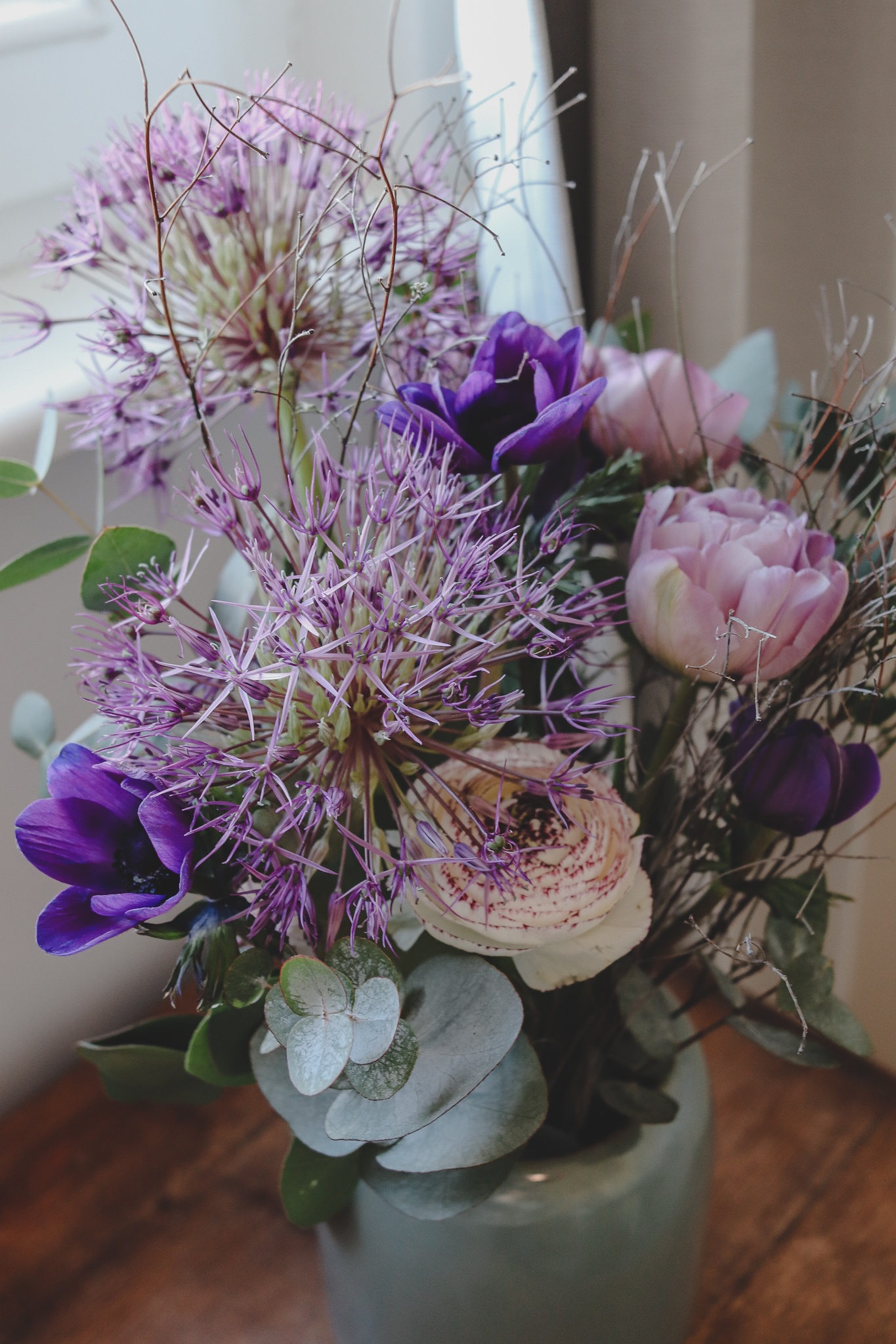 Dabei habe ich gute Erfahrungen mit den Bestellungen bei Bloomon (siehe Aufmacher) gemacht, weil die Blumen lange halten und wirklich schön sind. Ansonsten setze ich auf meine Brandenburger Lieblingfloristin Juliane Grützmacher vom Land-Hof in Schopsdorf. Die Familie Richert veranstaltet alle zwei Wochen einen Hofverkauf, bei dem ich Blumensträuße wie dieses lilafarbene Frühlingsträumchen gekauft habe.
