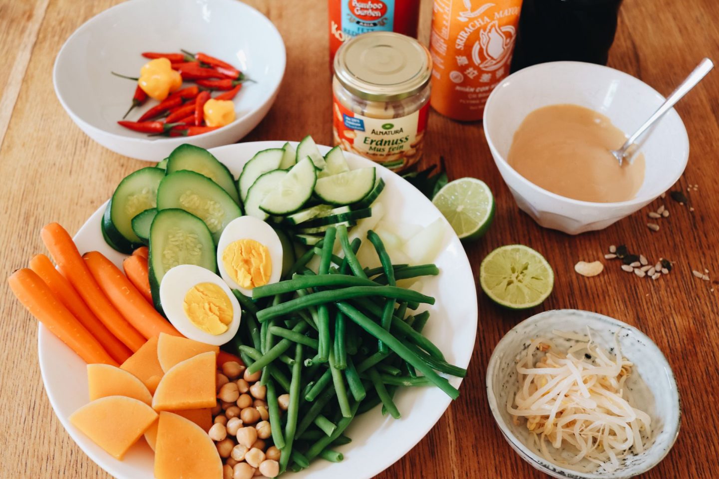 Das Gemüse auf einem Teller pro Sorte anrichten, nicht mischen. Die Kichererbsen und Sojabohnensprossen dazwischen und obendrauf geben. Das Ei pellen, halbieren und auf das Gemüse setzen. Wer jetzt noch Chiliflocken, geröstete Erdnüsse und frischen Koriander dazugeben möchte, legt los. Ich hatte nur ein paar Kerne – bin eben doch nur in Wusterwitz und nicht auf Bali. Aber das Gefühl ändert sich jetzt: Das Gemüse zusammen mit der Erdnusssauce servieren und von Indo träumen.