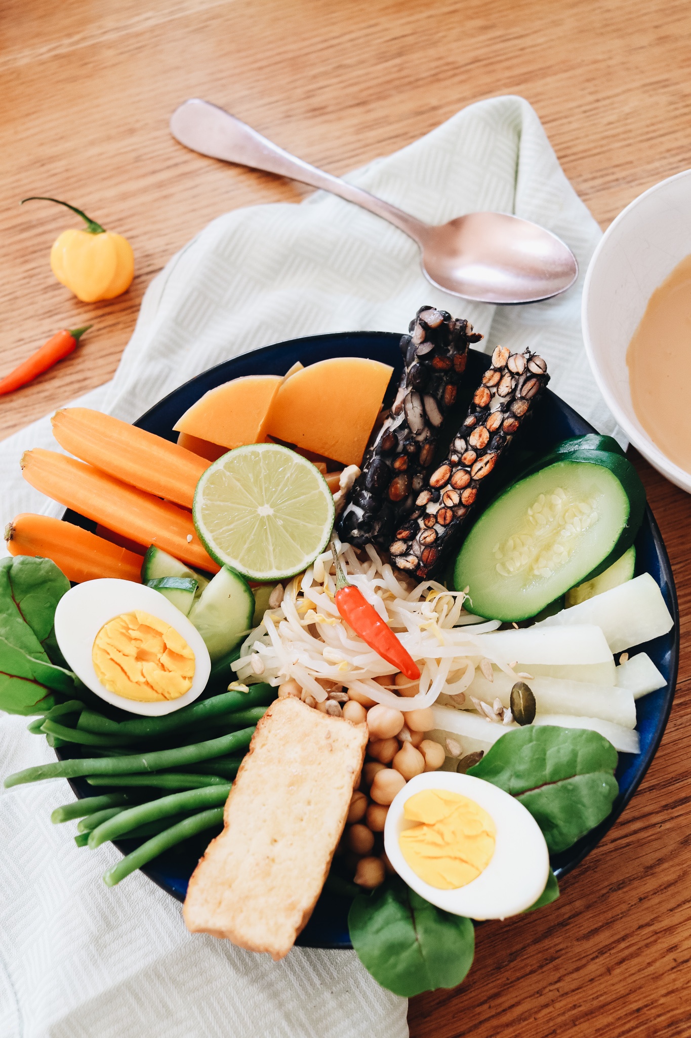 Ich war schon zehn Mal auf Bali und habe während meiner Zeit auf der Insel vor allem dieses vegetarische Gericht gegessen: Gado Gado. Das Wort bedeutet übersetzt „Durcheinander“ und bezeichnet einen lauwarmen Gemüsemix mit Ei, Tofu, Tempeh und Erdnusssauce.