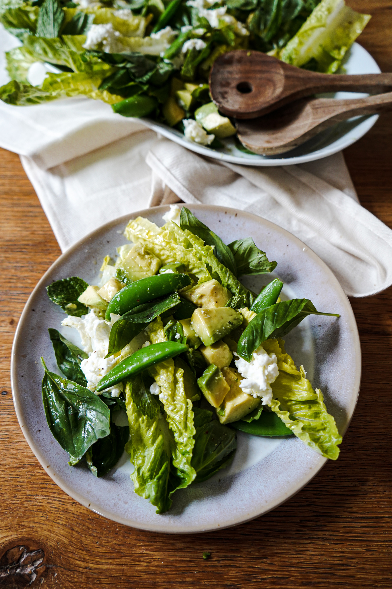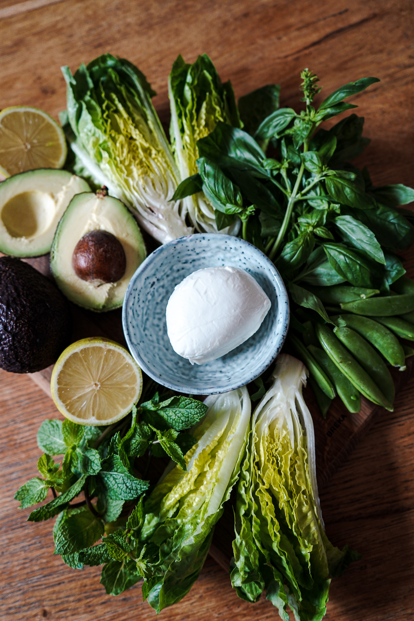 Römersalat zerpflücken, die Blätter waschen und trocken schleudern. Salatblätter in unterschiedlicher Größe wie Schiffchen auf einem großen Servierteller dekorieren. Zuckerschoten oder TK-Erbsen 1 Minute in Salzwasser blanchieren und abschrecken. Avocado schälen und in Würfel schneiden. Auf dem Salat arrangieren. Zuckerschoten kommen dazu. Minze und Basilikum grob von den Stielen zupfen und zu dem Salat geben. Büffelmozzarella abtropfen lassen, mit den Fingern zerpflücken und ebenfalls zu dem Salat geben. Von jeder Zutat sollte etwas zu sehen sein.