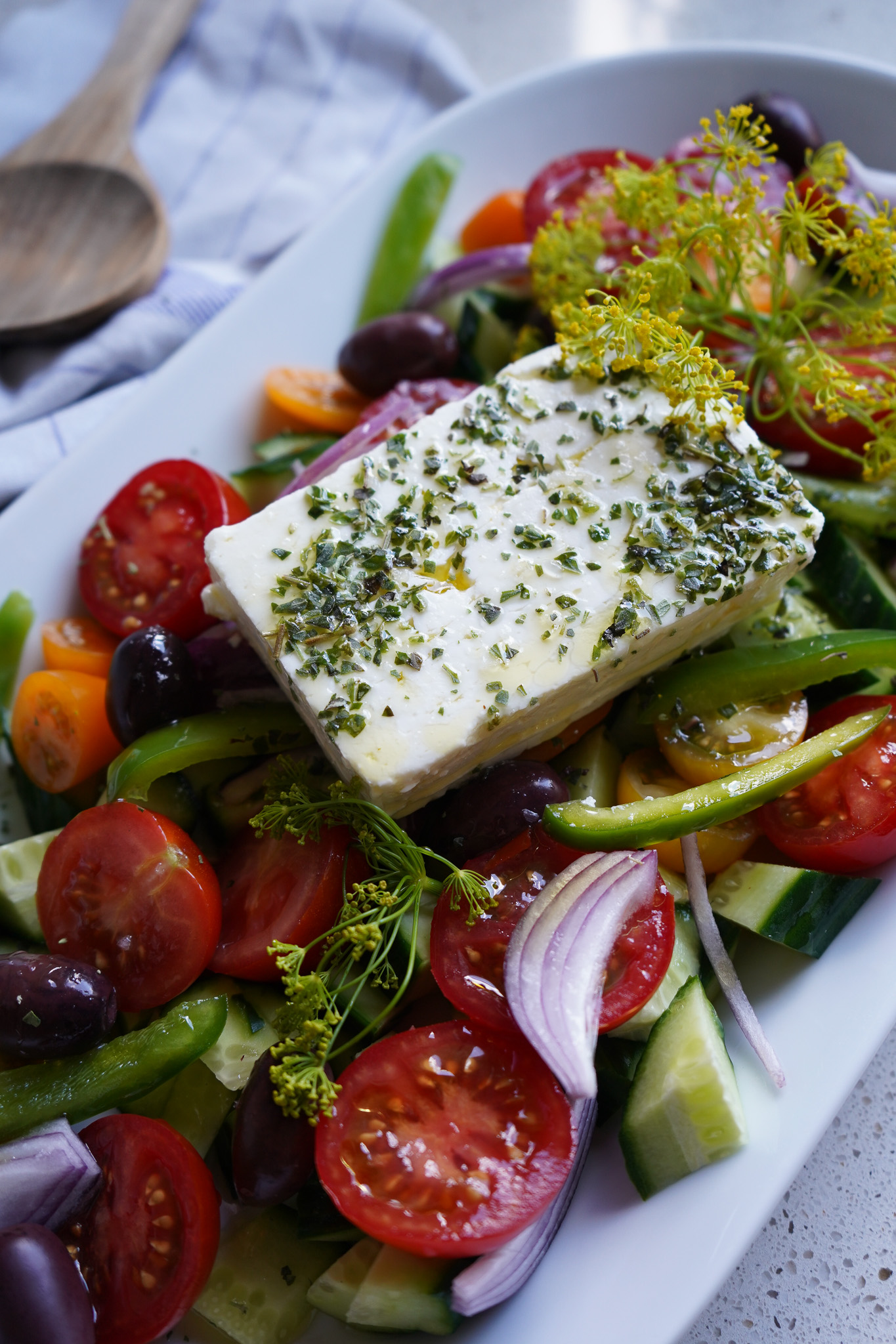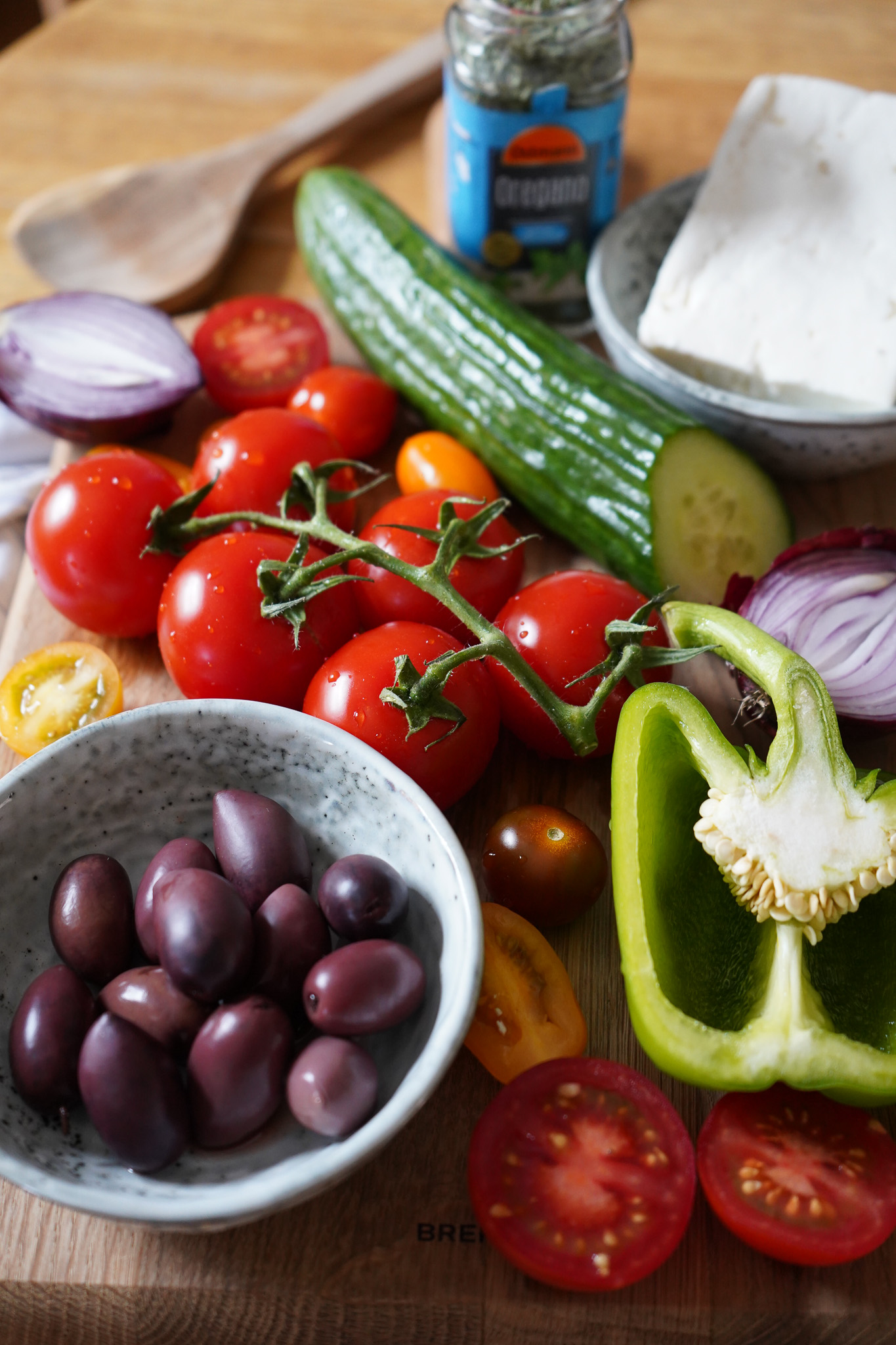Der Klassiker gelingt mit ein paar Tricks auch hierzulande köstlich. Der Feta muss hervorragend sein, denn er ist der Star und ich schneide ihn nicht klein, sondern serviere ihn ganz. Außerdem sieht es schön aus, wenn man verschiedene Tomaten verwendet und sie quer und längst aufschneidet. Bei den Oliven kommen für mich nur Kalamata-Oliven infrage. Sie sind reich an ungesättigten Fettsäuren, Antioxidantien und Vitaminen. Es gibt noch getrocknete schwarzen Oliven als Kreta, die gehen auch, sind aber Geschmackssache, weil sie etwas bitter sind. Was gar nicht geht, sind die kleinen schwarz gefärbten Oliven – ein kulinarischer Frevel!