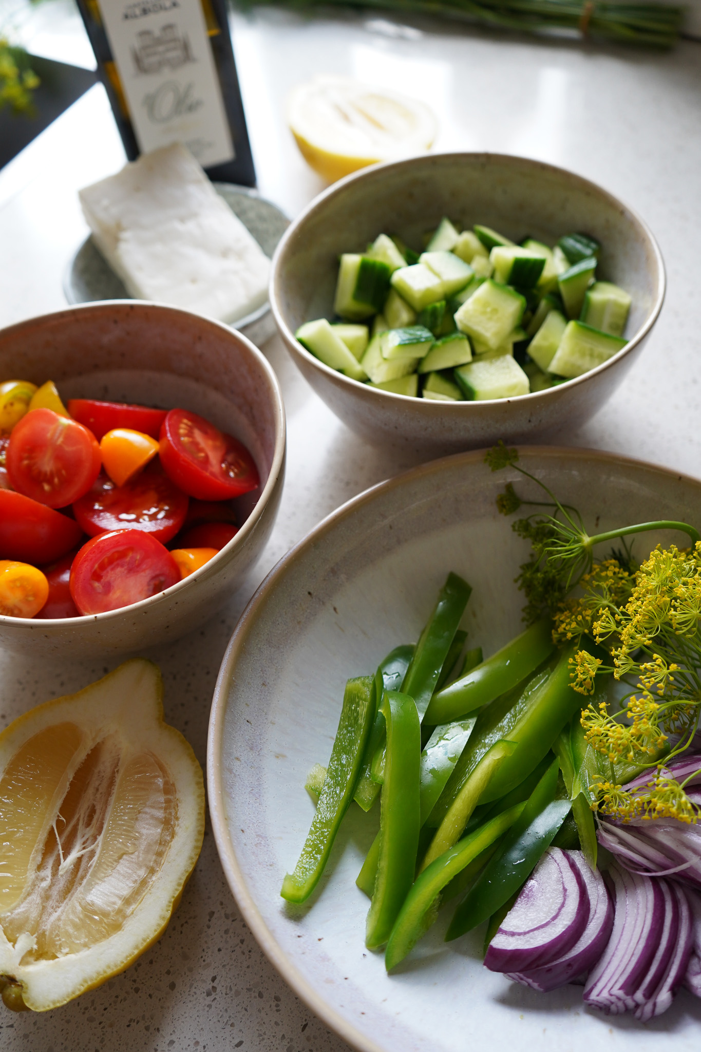 Tomaten, Paprika und Gurken waschen. Tomaten längst und quer halbieren. Gurken in Würfel schneiden. Paprika halbieren, Kerne und Stiel entfernen und in schmale Streifen schneiden. Zwiebel häuten, halbieren und in schmale Streifen schneiden. Gurken auf einer Platte oder großen Teller anrichten. Tomaten dazu, dann Paprika, Zwiebeln, Oliven. Den Feta auf den Salat setzen. Mit Oregano bestreuen. Alles salzen. Olivenöl großzügig über den Salat verteilen. Zum Schluss reichlich Zitronensaft über dem Gemüse auspressen – ich mache das bewusst nach dem Öl, weil dann das Öl mit den Kräutern schön auseinanderläuft. Gegebenenfalls nachsalzen. Mit Dillblüten oder Dill dekorieren.