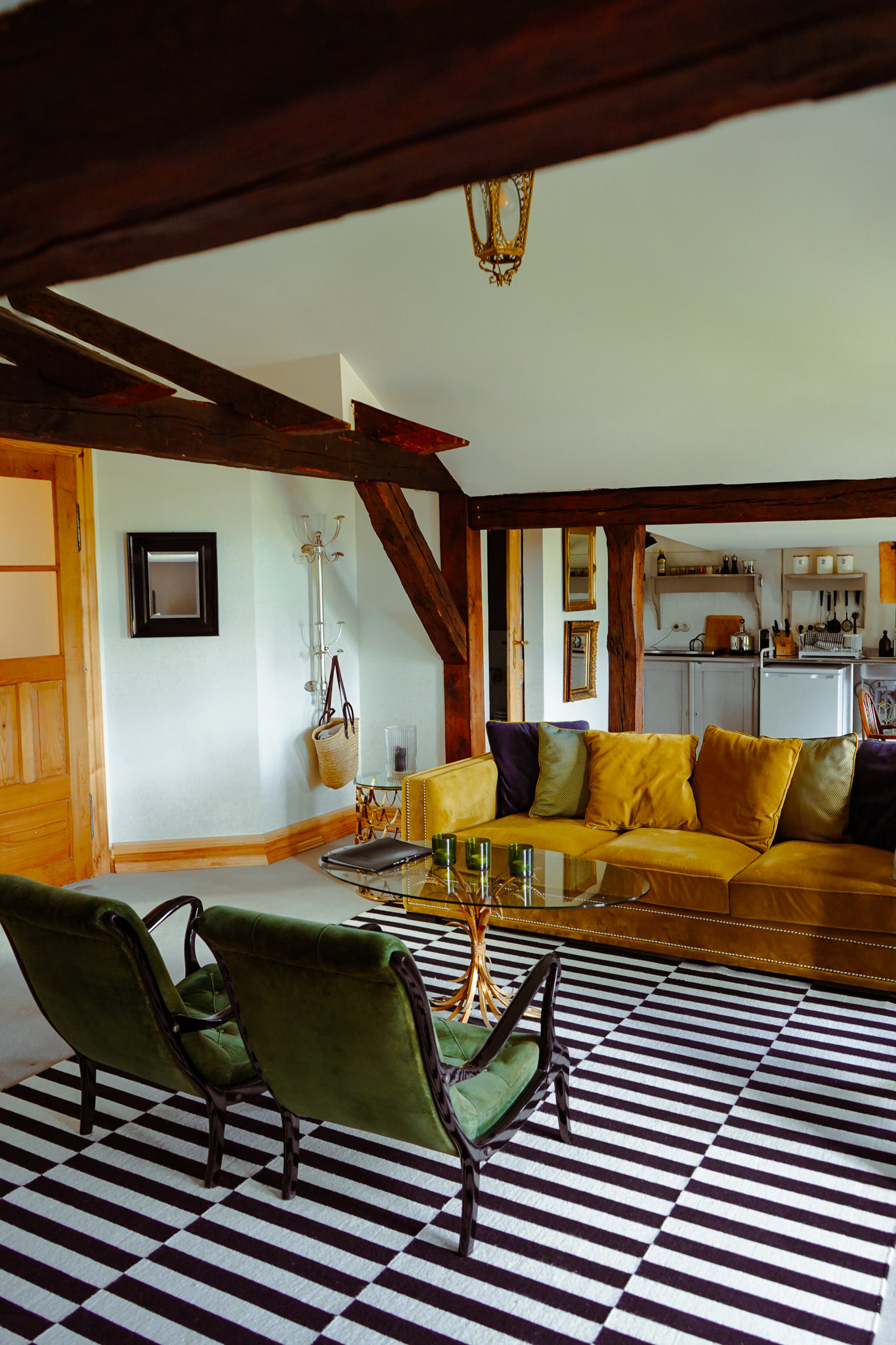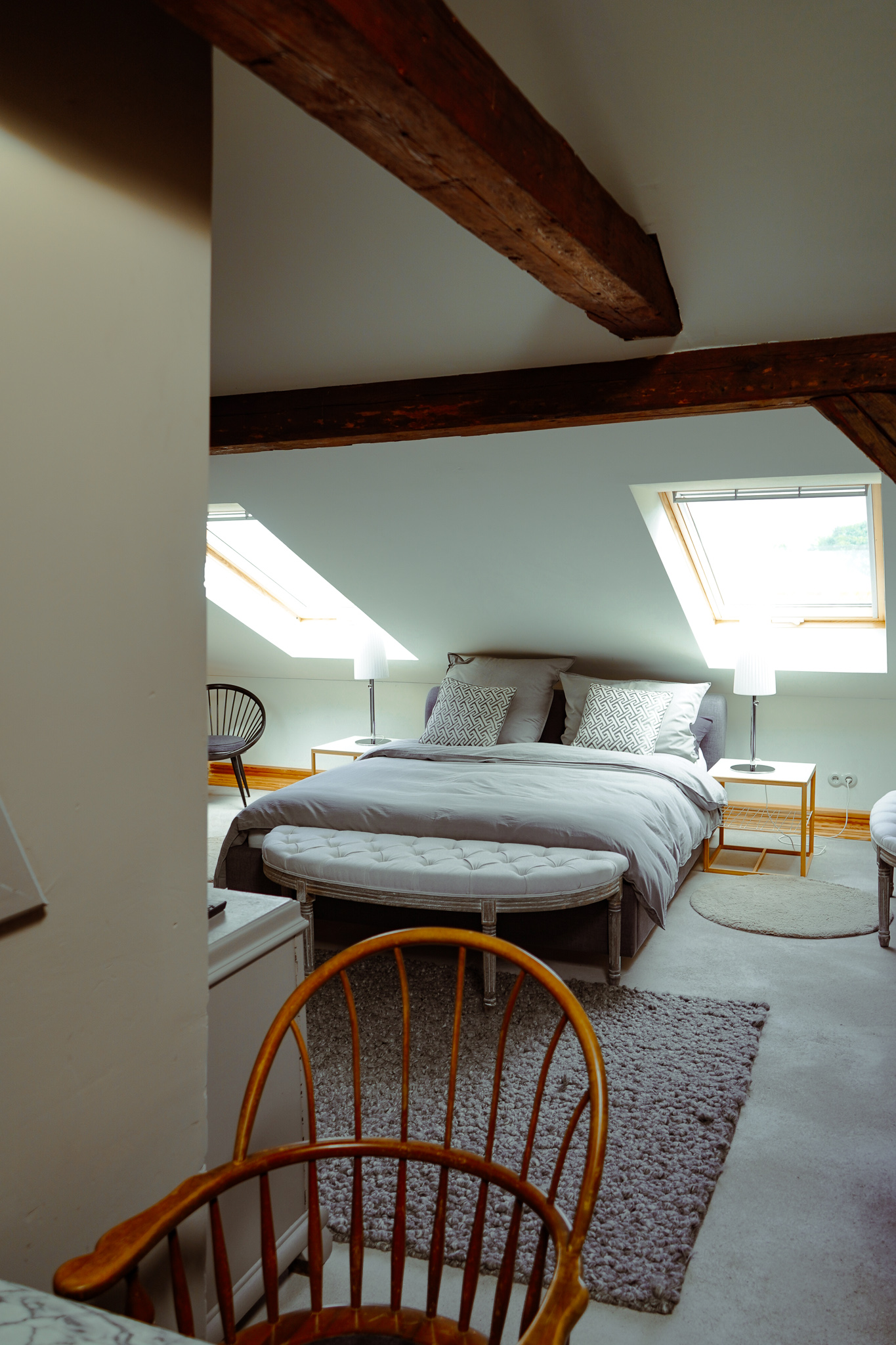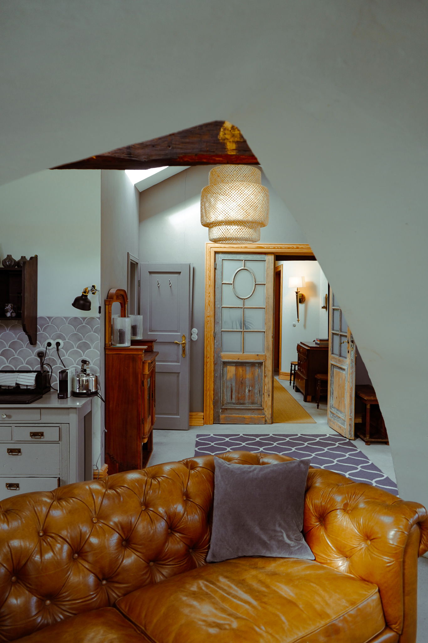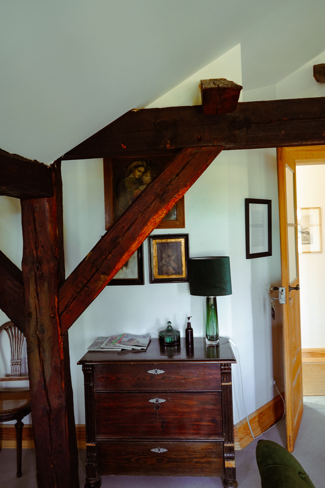 Gastfreundschaft liegt ihr im Blut. Sie kennt die Wünsche und Bedürfnisse ihrer Gäste, ist aber kleine klassische Hotelchefin, die mit dunkelblauem Blazer am Eingang steht und fragt, ob man einen schönen Tag hat. Eher trifft man sie früh morgens im Garten in Leggings und Sneaker, wenn sie mit den beiden Hunden Ingwer und Atesh von einem Spaziergang über die angrenzenden Felder kommt. Sie dekoriert drinnen und draußen frische Blumen, zündet abends überall Kerzen an und drückt uns vor der Treppe schnell noch eine 6er-Packung Eier für das Frühstück in die Hand – die stammen natürlich aus dem Betrieb von Karl und sind bio.