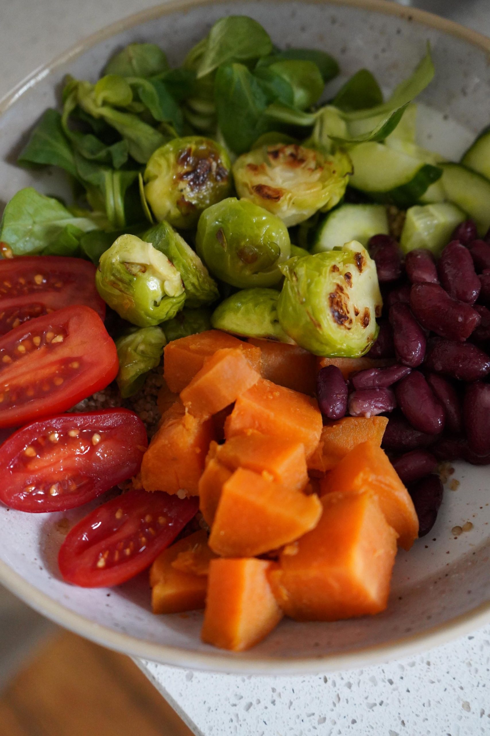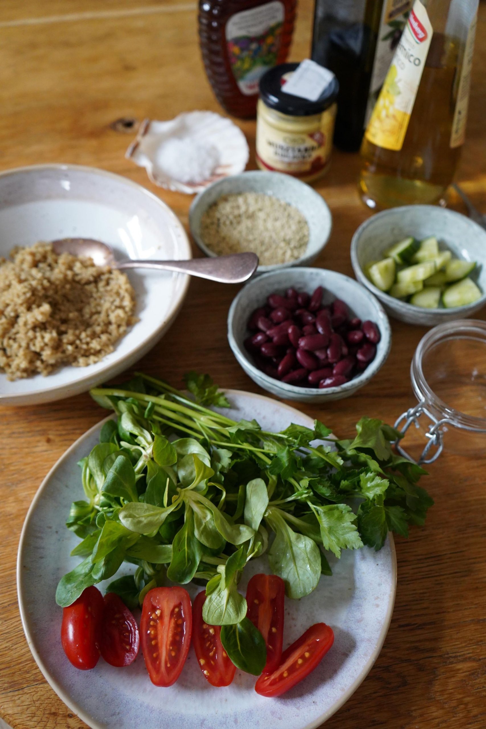 Quinoa waschen, in Salzwasser aufkochen und 10-12 Minuten quellen lassen. Süßkartoffel schälen und ebenfalls in Salzwasser garen. Beides kann man gut am Vorabend machen. Kidneybohnen abspülen und abtropfen lassen. Gurke und Tomaten waschen und ebenfalls abtropfen lassen. Feldsalat lesen und ggf. waschen, wenn er sandig ist. Quinoa ausdampfen lassen. Süßkartoffel aus dem Wasser nehmen, wenn man mit einer Gabel durchstechen kann und auskühlen lassen. Dann würfeln. Das Bio-Ei 8 Minuten hart kochen.