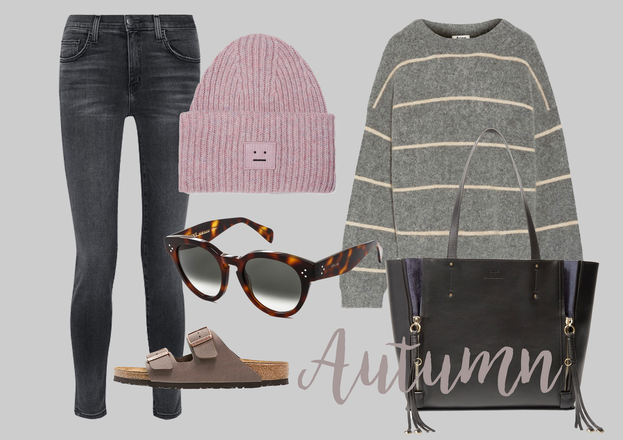 Pullover: Acne, Jeans: Current/Elliott, Mütze: Acne, Sonnenbrille: Céline, Shopper: Chloé, Schuhe: Birkenstock, Pullover mit V-Ausschnitt: Closed, Logo-Shopper: Céline