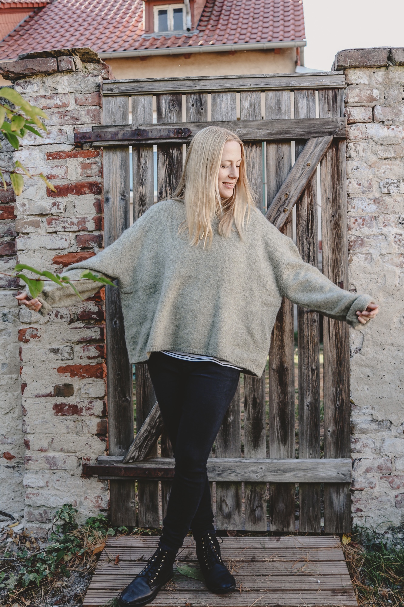 Mein Lieblingsoutfit im Moment: Oversized-Pullover, meine enge, aber sehr bequeme „Stiletto Jeans“ von Current Elliott, in die ich dank Stoffwechselkur wieder reinpasse, und die schwarzen Boots von & Other Stories, die ich schon letztes Jahr gekauft habe und die es diese Saison wieder gibt.