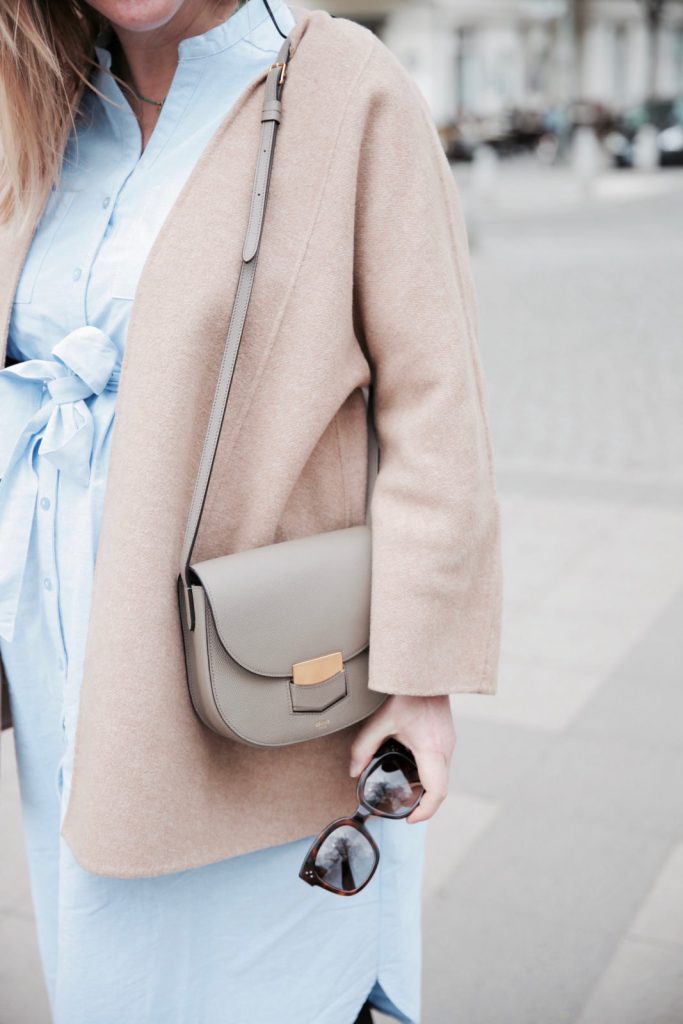 Kleid: Mint & Berry Mom, Jacke: Zara (alt), Sneaker: Adidas Iniki, Tasche + Sonnenbrille: Céline