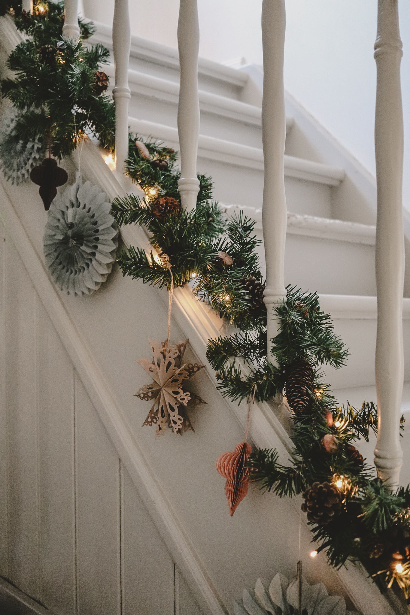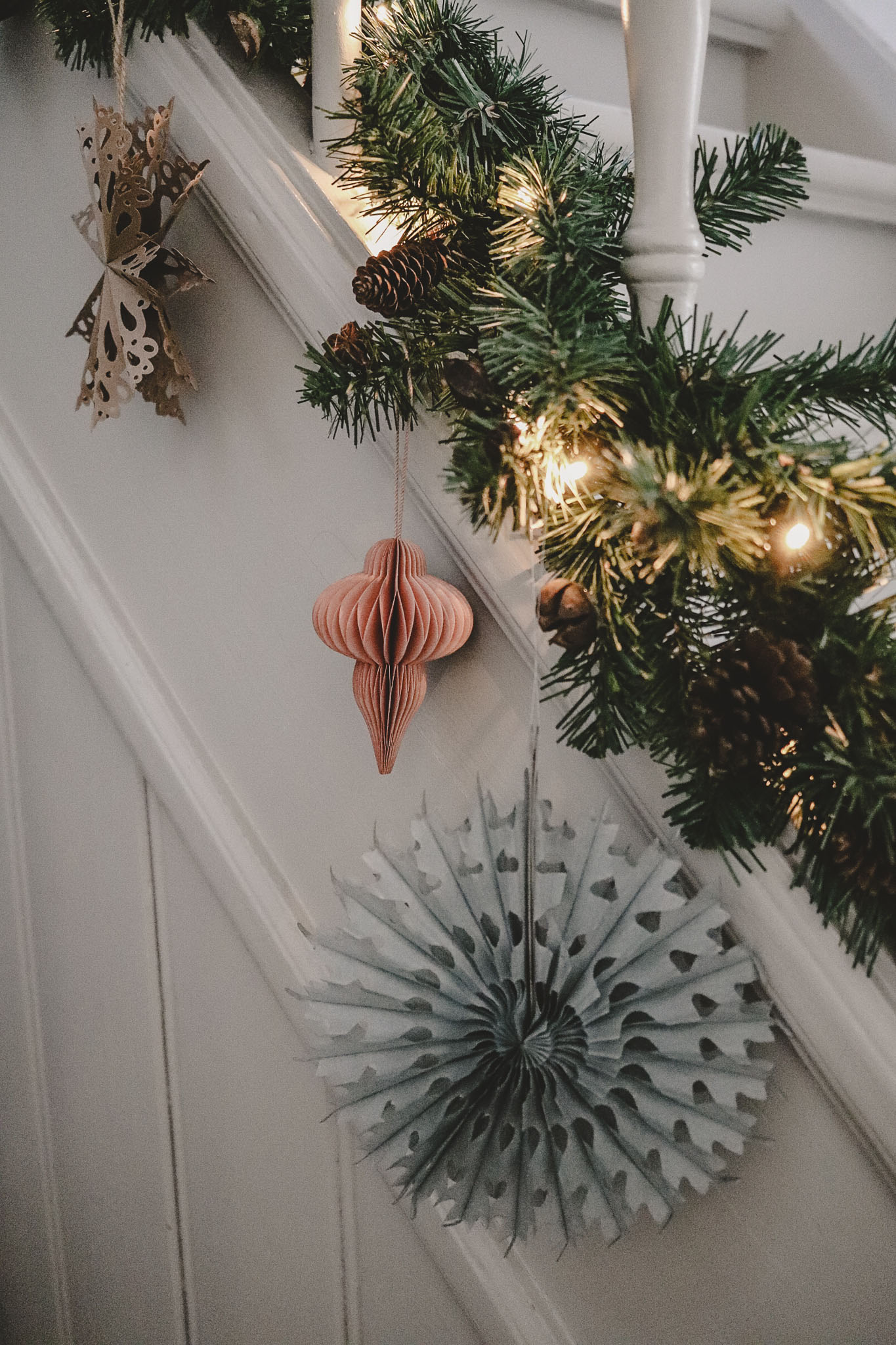 *Affiliate LinksBraune Sterne: Broste Copenhagen, Plissierte Papier-Anhänger in Dunkelrot und Rosa: Arket, graue Schneeflocken: leider vergessen, Girlande mit Lichterkette: Baumarkt oder über ebay