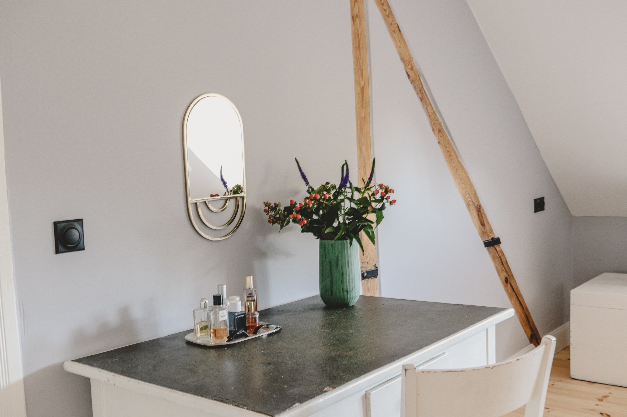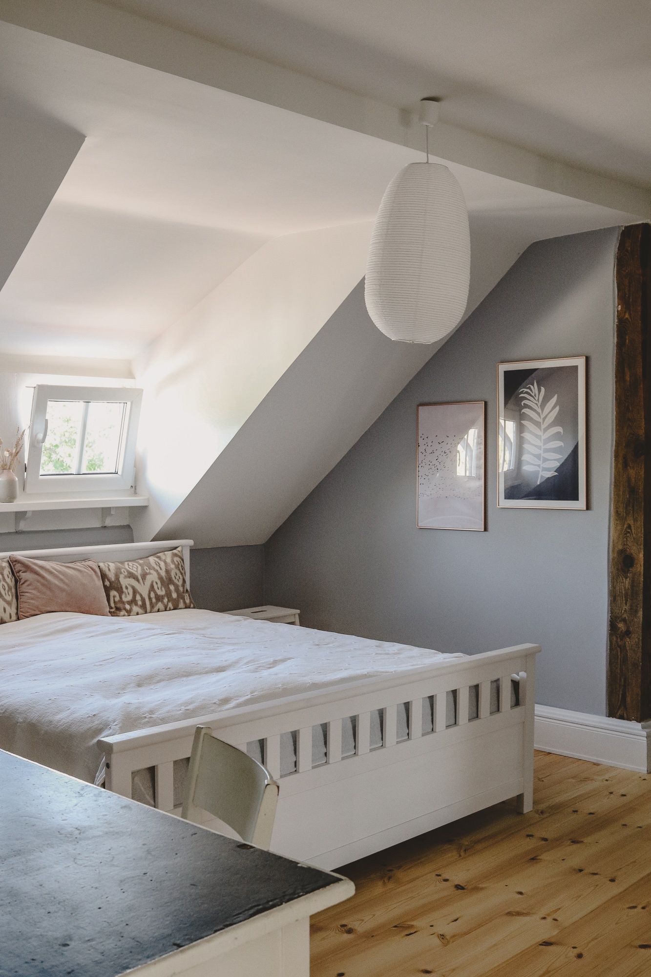 In diesem Zimmer war eigentlich erst das Home Office geplant, deshalb haben wir hier die Steckdosen doof geplant. Trotzdem wollte ich lieber hier schlafen, da dieses Kämmerlein schön ruhig ist und außerdem direkten Blick auf den See bietet. Den Fußboden mussten wir in diesem Raum neu verlegen, da die alten Dielen durchhingen. Deshalb ist das Holz hier etwas heller, als in den anderen Räumen.