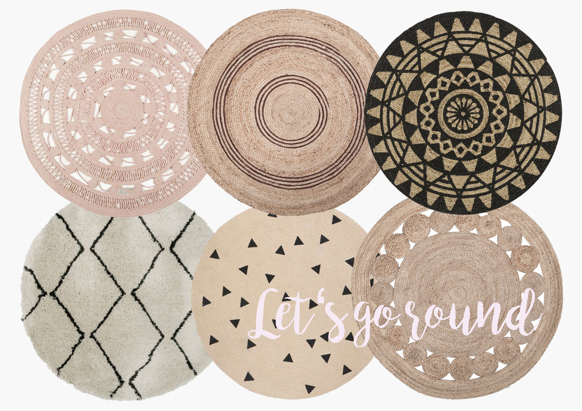 Eine Ecke im Flur erweist sich jedoch als schwer zu dekorieren: Das kleine Atrium vor der Treppe braucht einen runden Teppich, denn eckig funktioniert hier nicht. Es ist gar nicht so einfach da etwas Hübsches im Netz zu finden, deshalb zeige ich euch hier meine besten Fundstücke (v.l.n.r.):