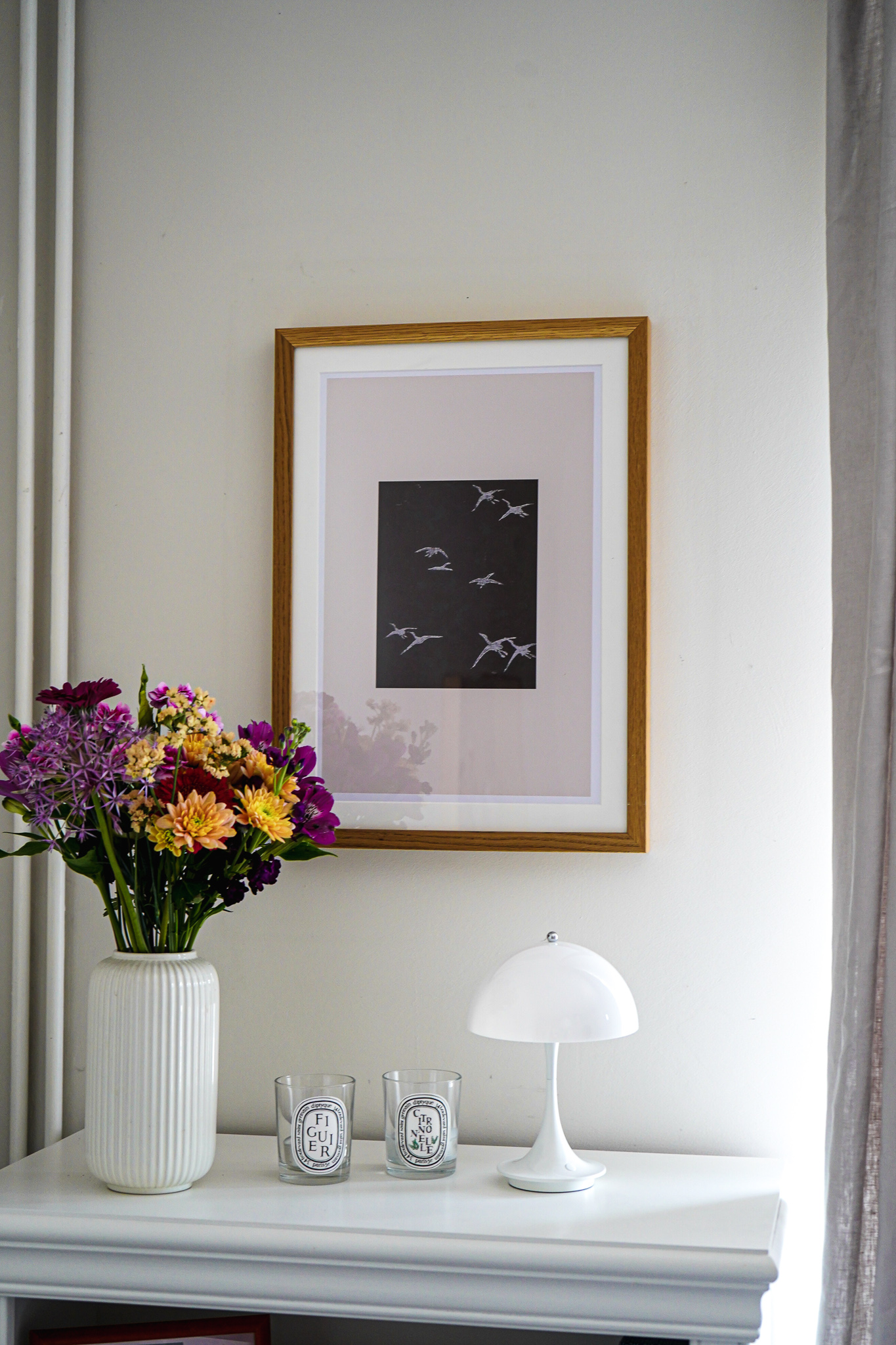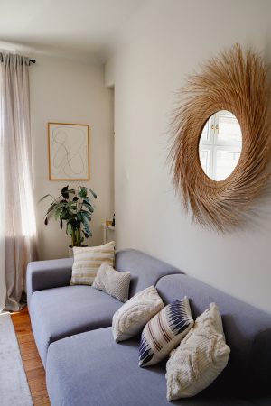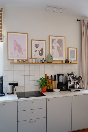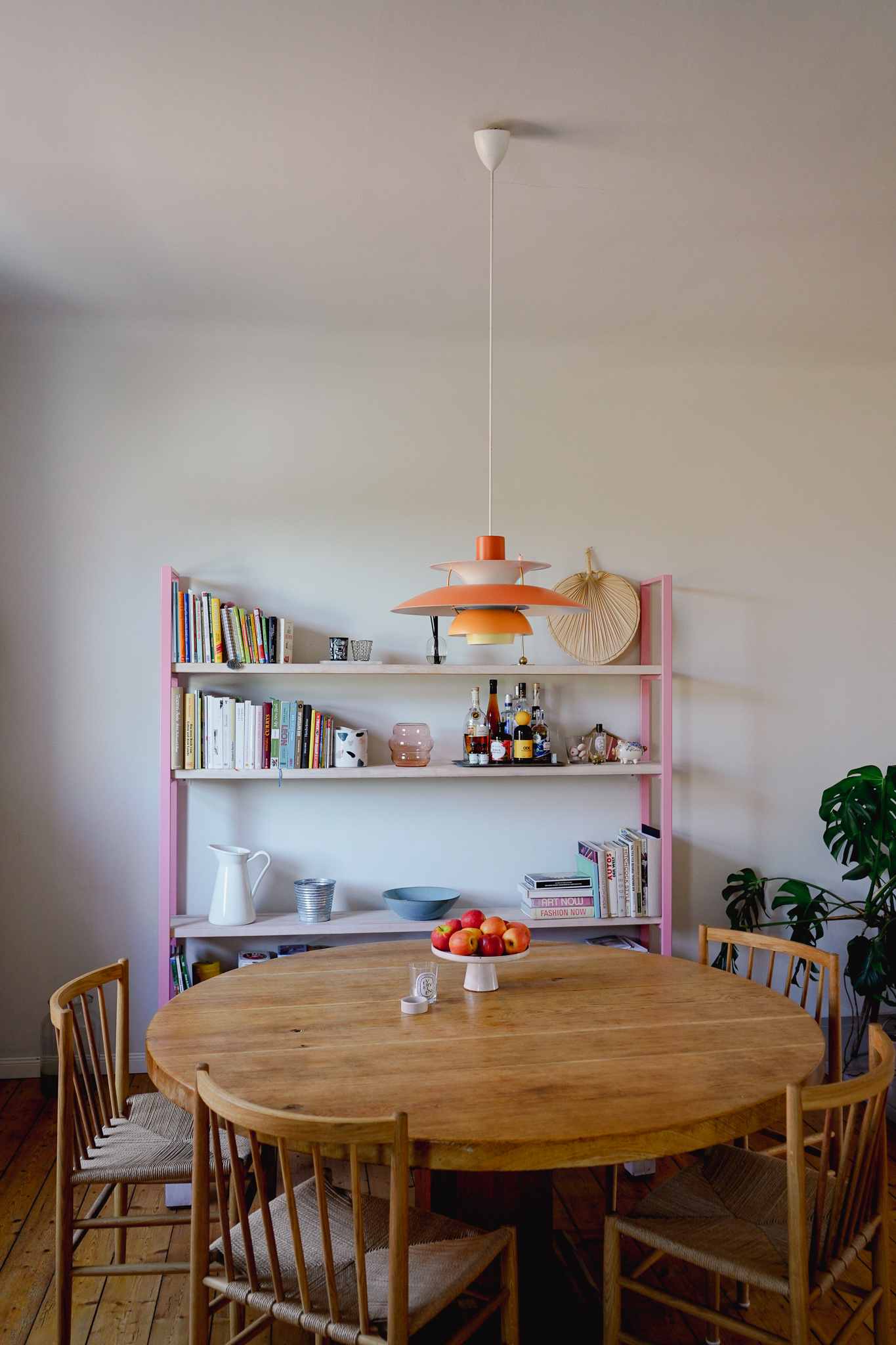*Affiliate LinksKüche: Ikea mit Veddinge-Fronten, Griffe: Superfront, Wandregal: Holzliebling, Bilder: Juniqe, Kelim-Teppich: Trendcarpet, Sofa: Mycs, Kissenhüllen: Westwing und The Weavery, Runder Spiegel: Maisons du Monde, Esstisch: Vintage, Stühle: J80 Chair in Natur geölt von FDB Mobler, Lampe: PH5 Lampe von Louis Poulsen, Rosa Regal: Johanenlies