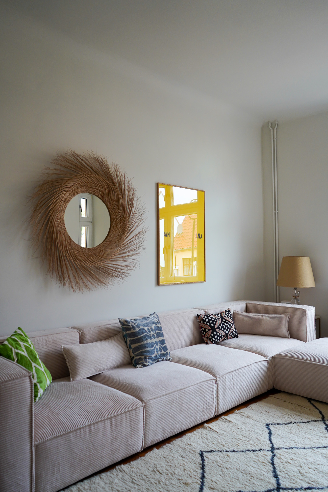 Kaum war die Küche drin, klingelte die Spedition und brachte unsere neue Cord-Couch. Wir haben uns für Kilhe von The Masie in der Farbe „Beige Seashell“ entschieden. Meine Eltern hatten früher auch eine Cord-Couch und für mich ist das ein schönes Design-Revival. Die Lehnen sind höher und fester als bei unserem Vorgänger-Sofa, das nach acht Jahren und zahllosen Jump-Sessions der Kinder in Rente gehen darf, genauer gesagt, über Kleinanzeigen eine neue Besitzerin gefunden hat. Meine Mutter konnte auf dem Sofa gar nicht gut sitzen, deshalb haben wir jetzt eine Sitzmöglichkeit geschaffen, die hoffentlich für Jung und Alt funktioniert. Ich habe das Sofa mit einem Textilspray imprägniert. Essen ist trotzdem strengstens verboten!