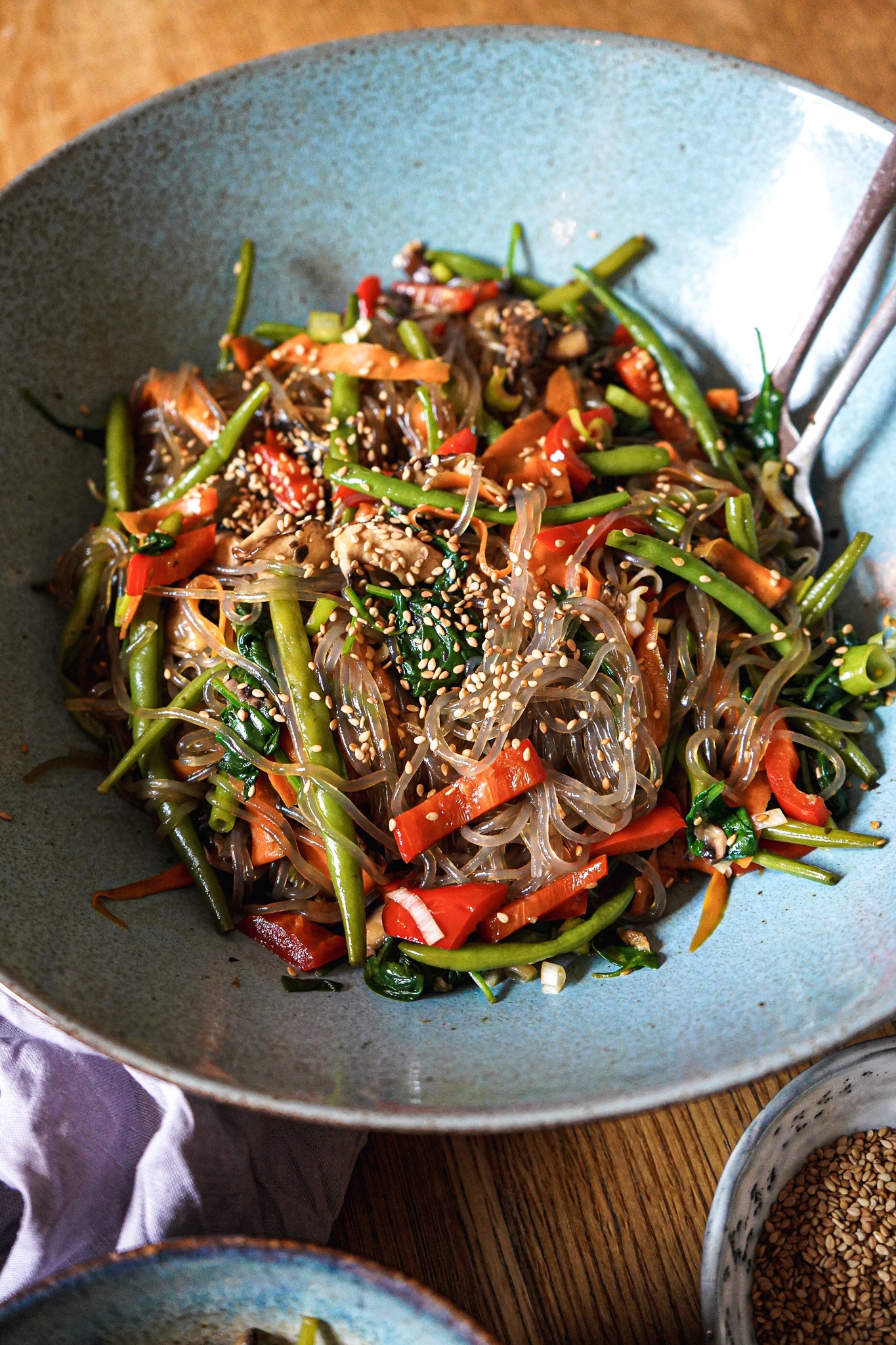 Der Hack: Die Gemüsesorten werden einzeln angebraten. So behalten Paprika & Co. nicht nur ihre bunte Farbe, sondern ihren individuellen Geschmack. Das Ergebnis: ein kleines Aroma-Spektakel! Ansonsten wäre es es gebratenes Gemüse mit Glasnudeln. Fleisch brauche ich dazu persönlich gar nicht mehr, deshalb habe ich es weggelassen. Wenn Fleisch euer Gemüse ist, empfehle ich euch Minutensteaks oder Filet. Was ich mit oder ohne Fleisch an diesem Rezept genial finde: Japchae schmeckt lauwarm, aber auch kalt am nächsten Tag.