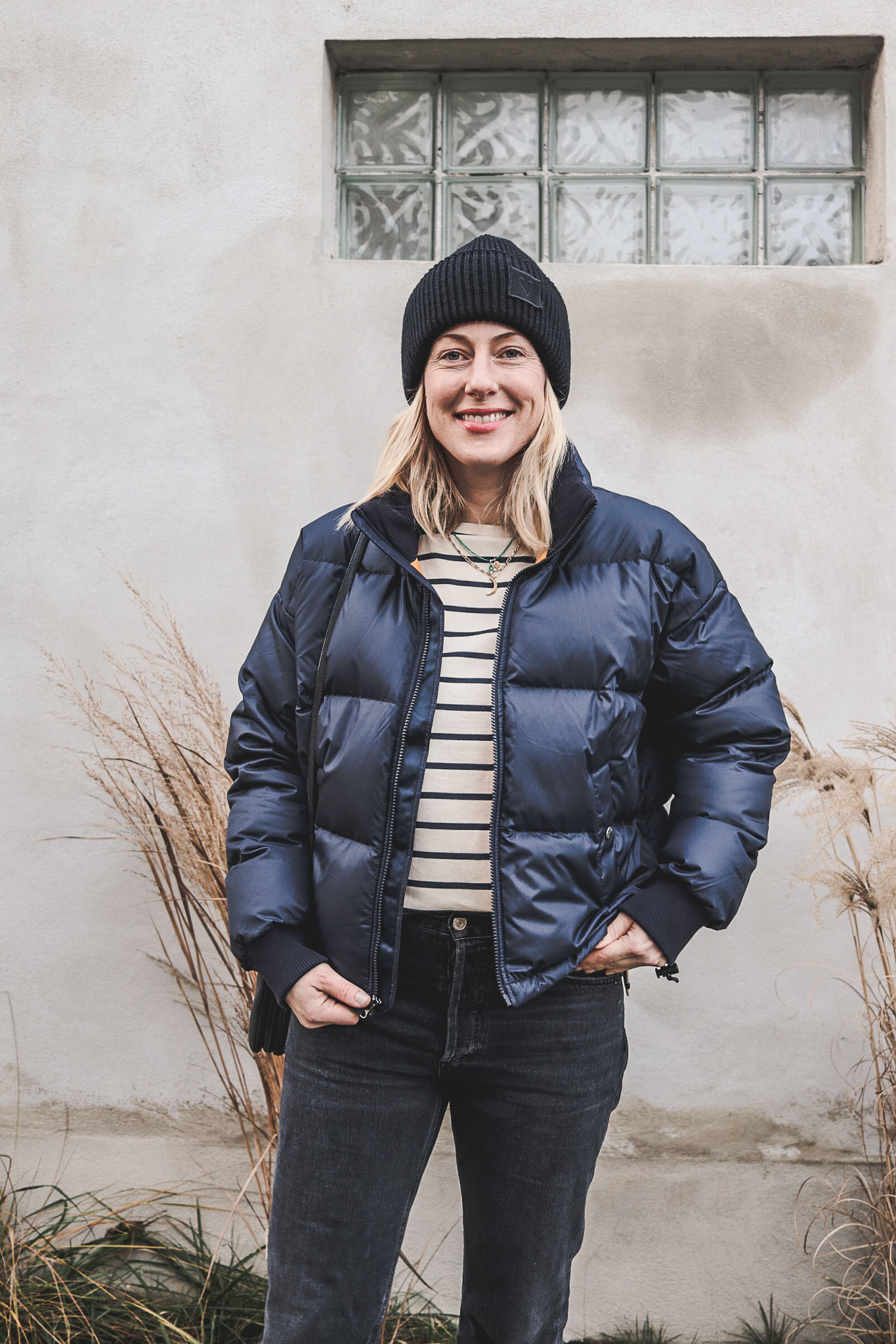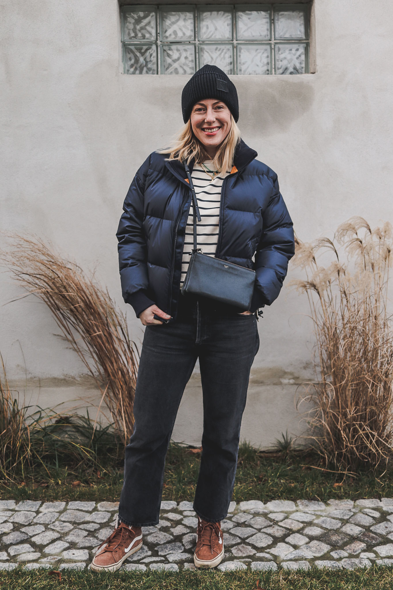 Mütze: Yes my Love Kids (PR-Geschenk), Jacke: The North Face Paralta, Marinière: Weekend Max Mara, Jeans: Agolde über April First, Tasche: Céline, Schuhe: Vans, Schmuck: Maximova x Closed, Satya Jewelry