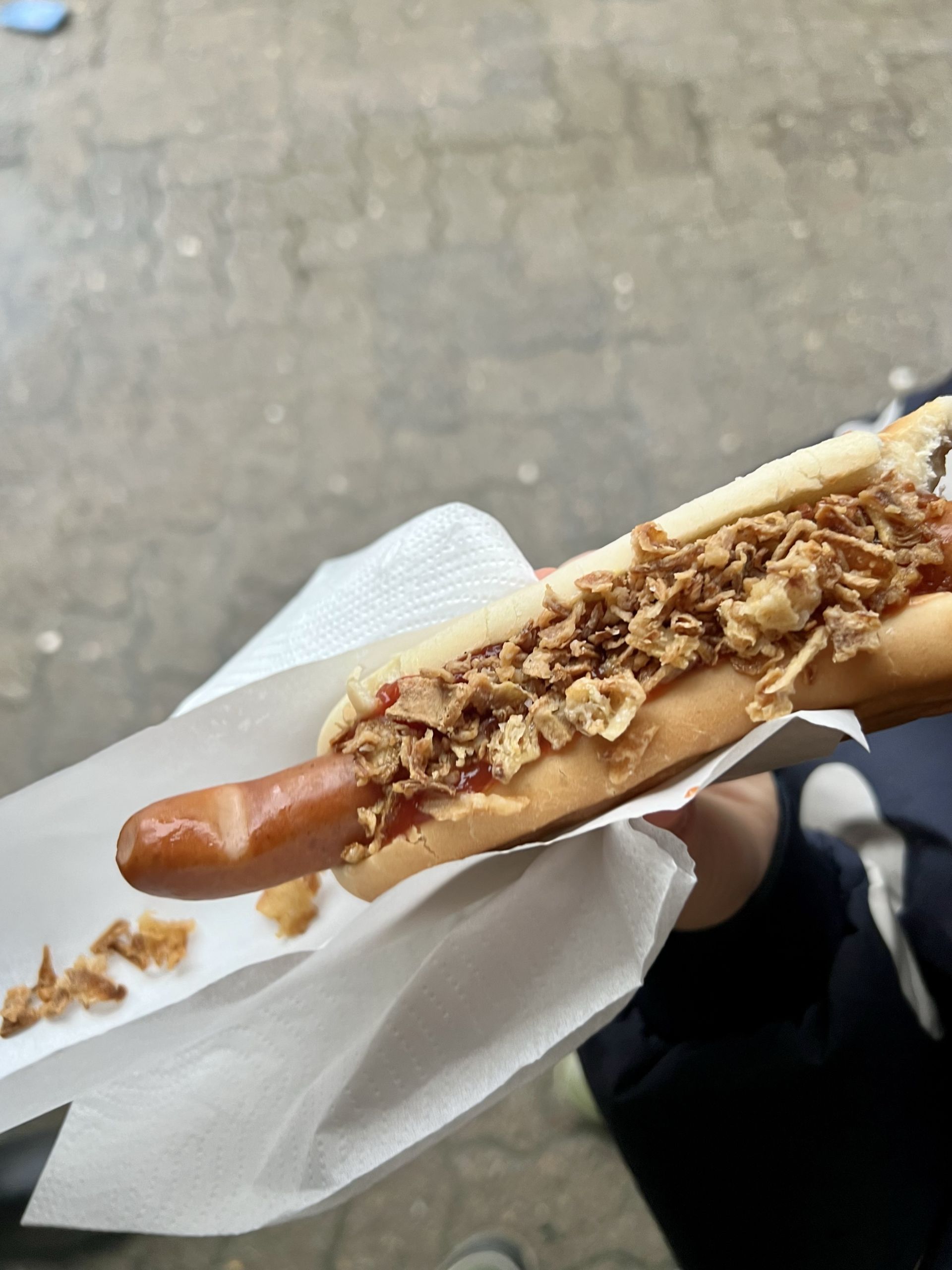 Kaffee und Zimtschnecken bei der Bäcker-Kette Lagkagehuset gehen immer, auch das Frühstück und die grünen Säfte sind gut. Ein Muss: Hotdog am Büdchen z.B. auf dem Rathausplatz oder Vesterbrogade Ecke Værnedamsvej. Meine Tochter isst in Dänemark jeden Tag mindestens einen Hotdog, weil sie so lecker sind und nicht mit dem schlaffen Würschtl von Ikea zu vergleichen. Der Senf ist eine Mischung aus Mayo und Senf und wenn man Glück hat, dann wird das Brötchen vorher geröstet. Man kann den Hotdog mit Wiener Würstchen oder roter Wurst bestellen. Wir nehmen Wiener, Ketchup und Zwiebeln.
