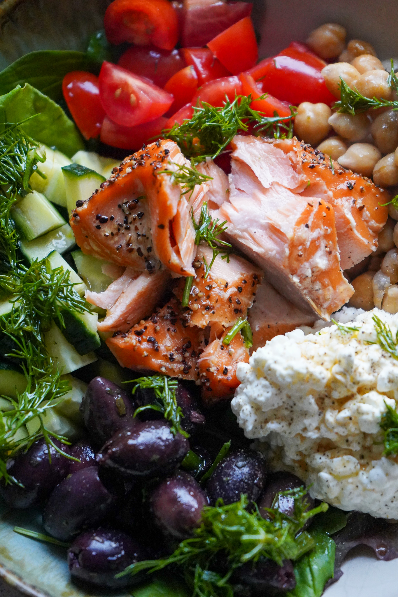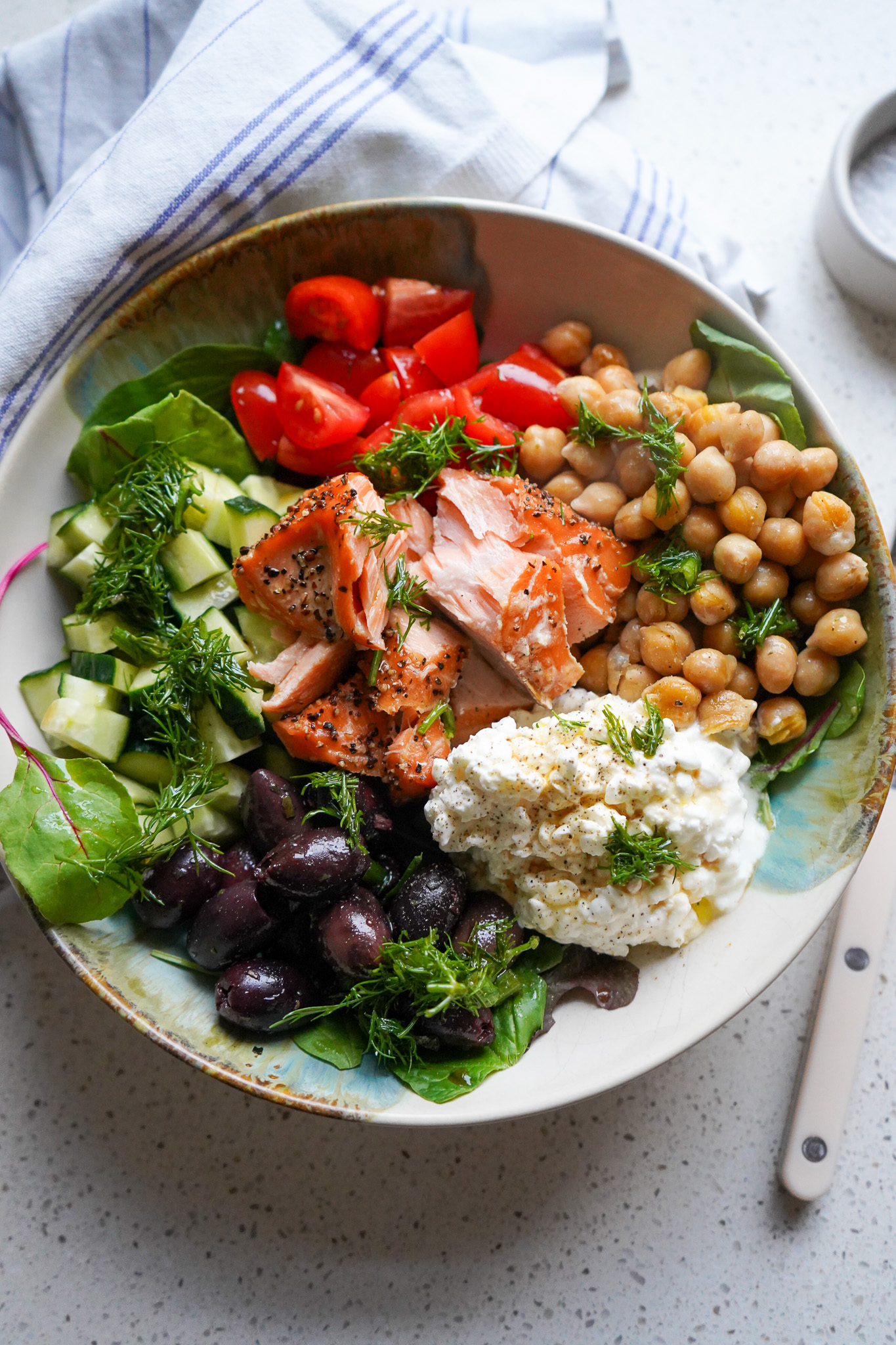 Hunger! Eine Lachs-Protein-Bowl mit Hüttenkäse, Kichererbsen, Oliven und Dill-Dressing klingt nach einem wilden Mix, ist aber vor allem 1. lecker und 2. ein echter Sattmacher. Der Hack bei dieser Bowl bzw. lauwarmen Salätchen: Die Kichererbsen werden vorher in Öl angebraten und mit Kräutersalz gewürzt.
