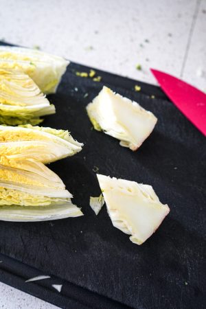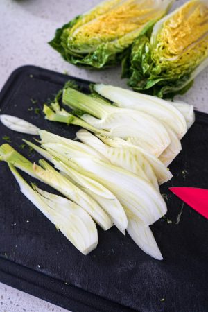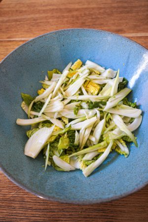 Beim Fenchel habe ich mir selber etwas ausgedacht, um dieses Gemüse als perfekte Salatzutat tauglich zu machen. Ich mag Fenchel aufgrund der anisähnlichen Geschmacks, aber roh muss man ihn lange kauen. Deshalb habe ich den Fenchel vorher dünn geschnitten und mit Essig, Salz und Agavensirup gepickled, also eingelegt. Das kann man auch mit roter Zwiebel machen, die ebenfalls gut in diesen Salat passen würden.